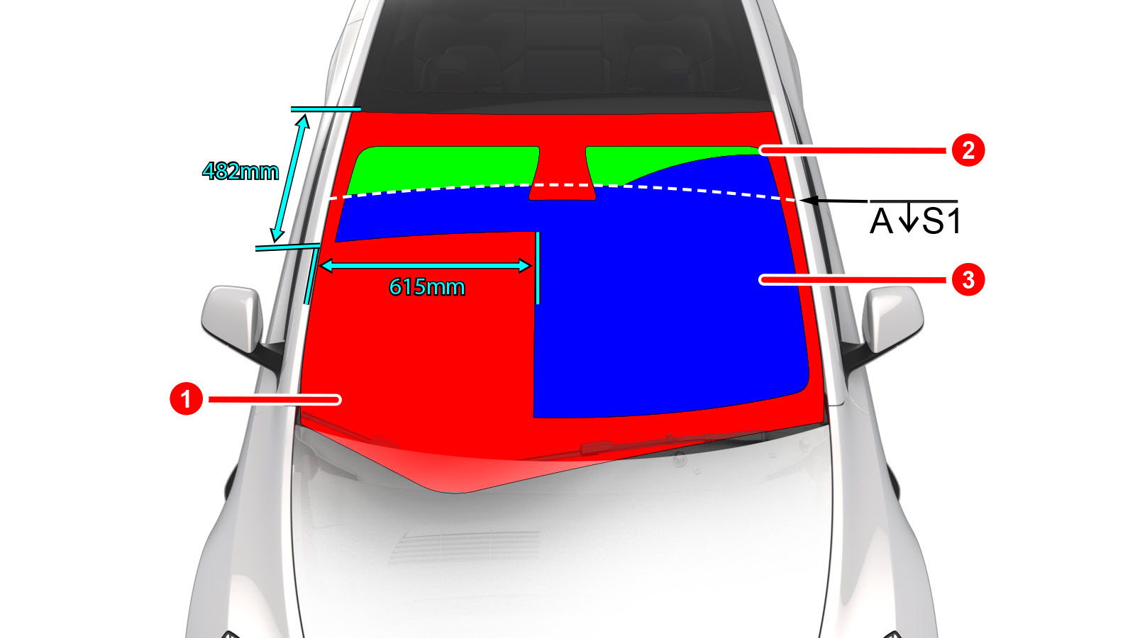 Repairs allowed in area 1: None; if the windshield is damaged in this area, it must be replaced. |