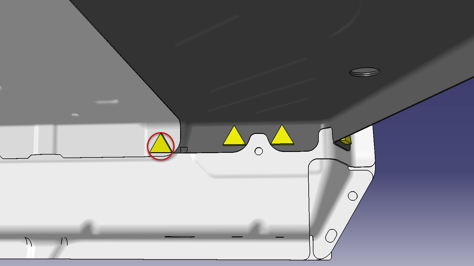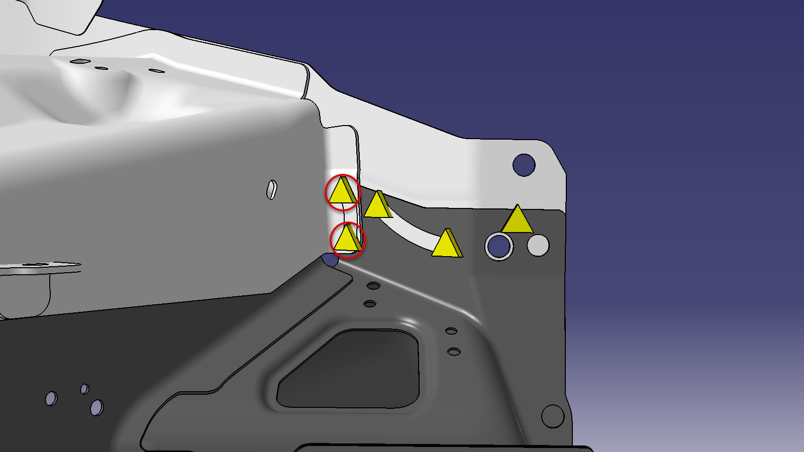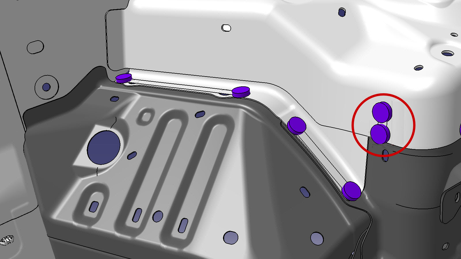 NoteThe area circled in red was secured with up to 3 spot welds (removed in a previous step). Install one rivet for each spot weld that was removed from that area, but do not add additional rivets.