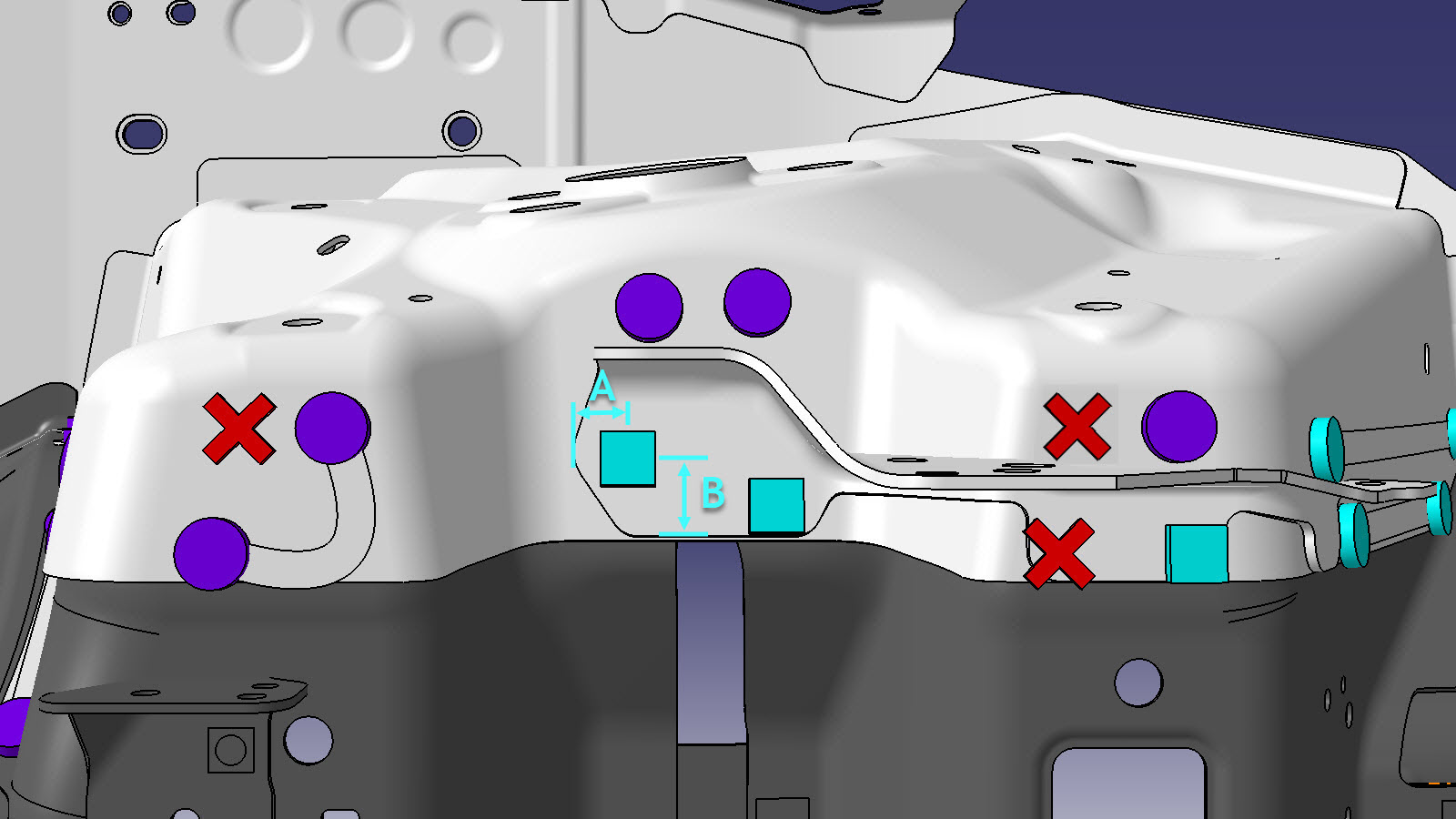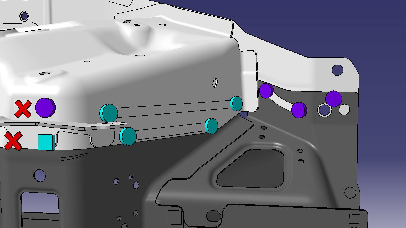NoteA red X indicates a location where a factory-installed fastener is not being replaced.