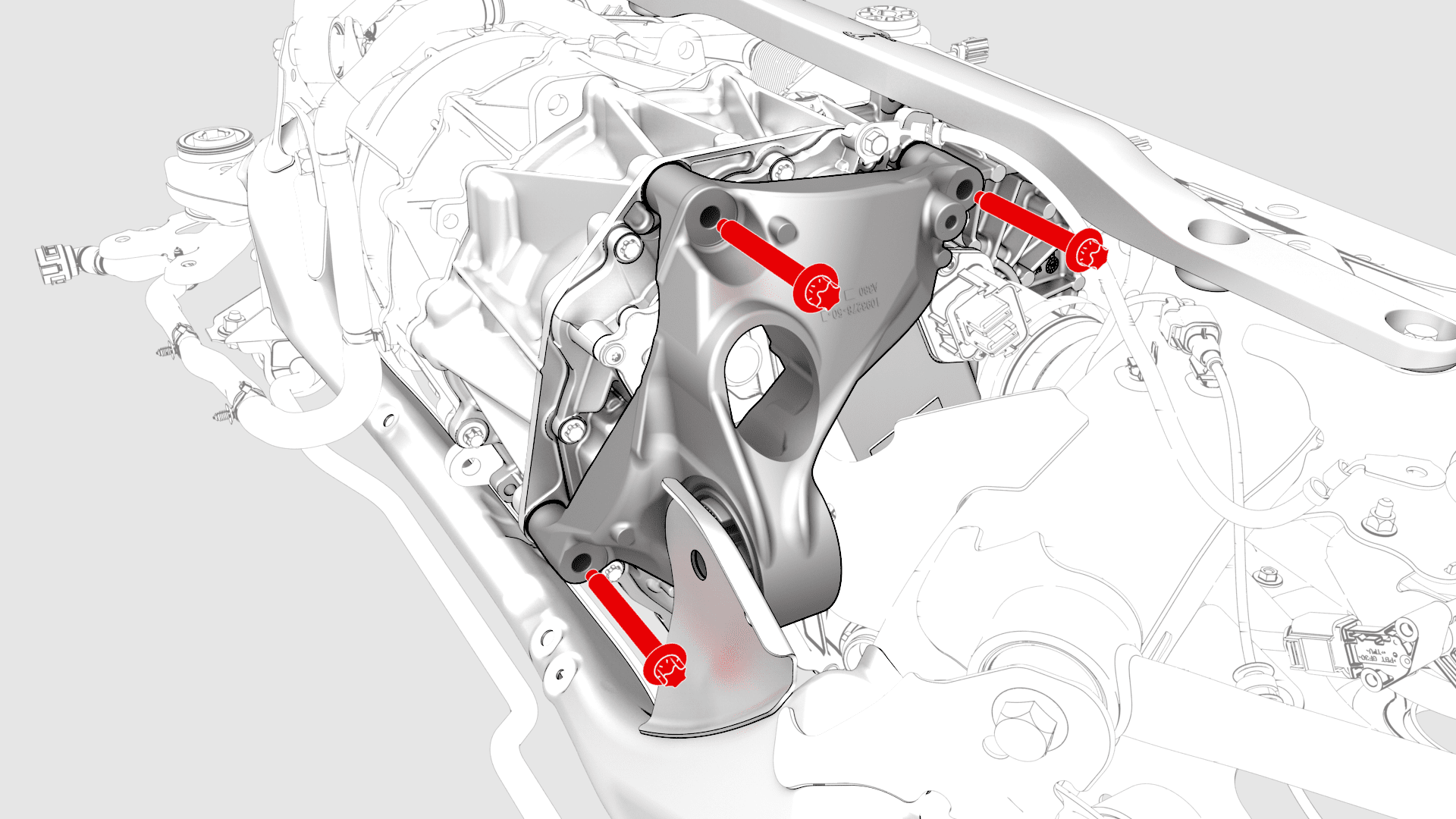 - Install the LH rear drive unit mount to the rear drive unit, and then hand-tighten the bolts (x3) that attach the mount to the rear drive unit.