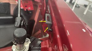 - Remove the double sided tape backing, and then install the LH active hood corner bracket into the vehicle.