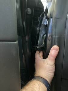 - Push outward on the top of the door near the speaker with one hand, and then feed the LH upper front door hinge upward and then outward towards the rear of the vehicle to remove it.