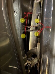 Torque the bolts (x3) that attach the LH upper front door hinge to the body.