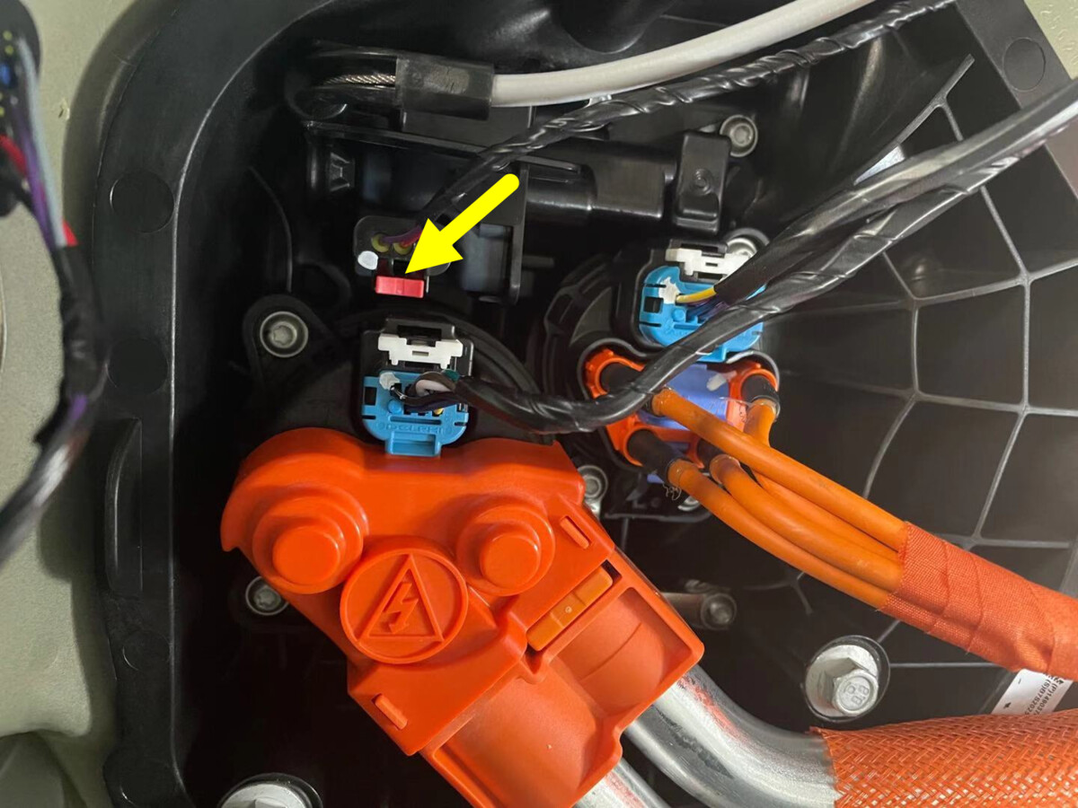 - Connect the AC logic connector on the charge port, and then install the white locking tab.