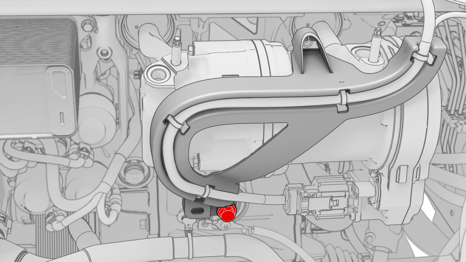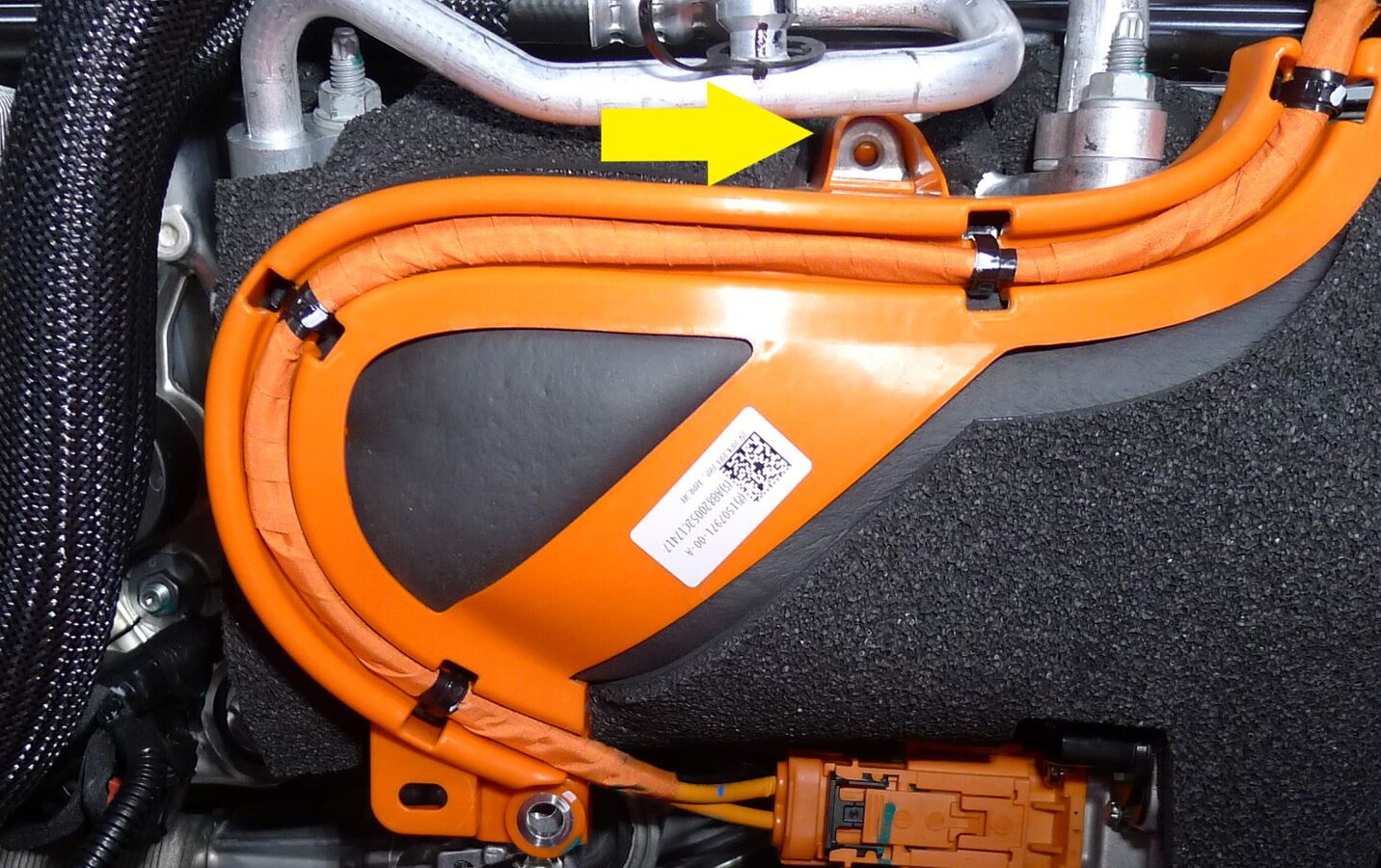 - Release the HV connector bracket from the stud near the LH side of the firewall.