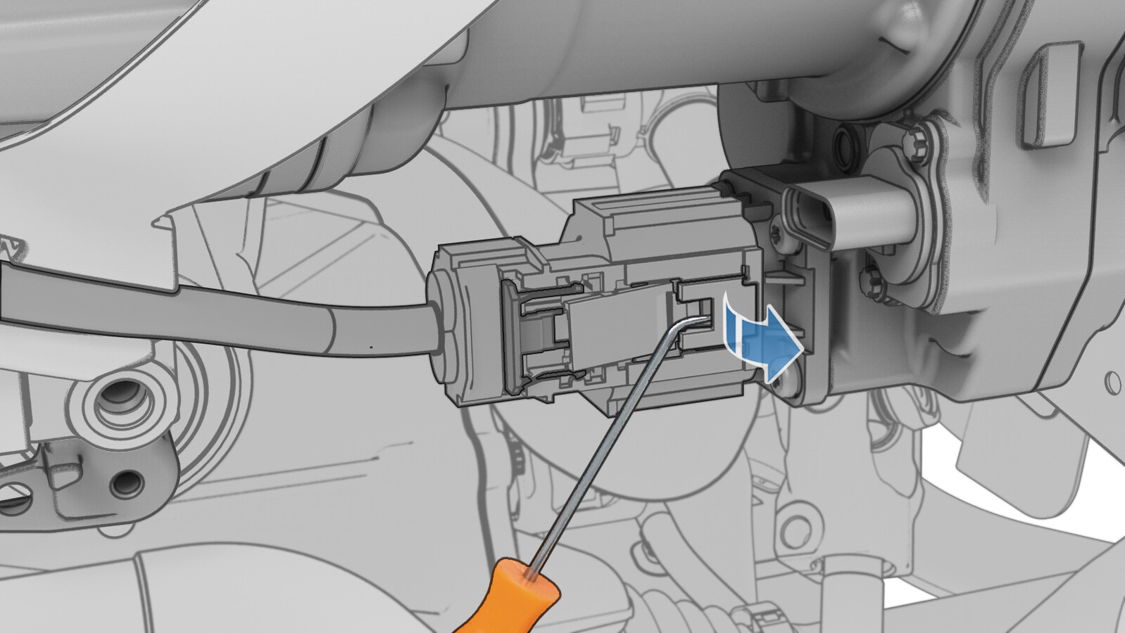 - Using a 45-degree pick, simultaneously push on the central locking tab while pulling on the outer locking tab, and remove the HV connector from the A/C compressor.