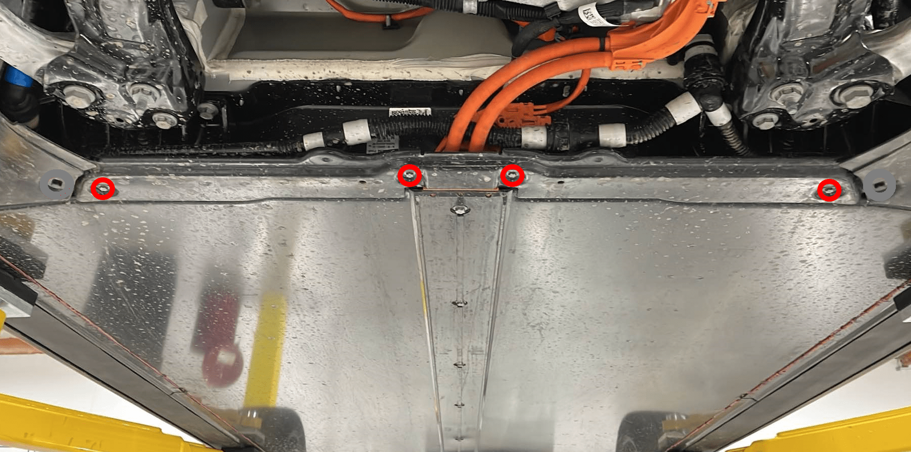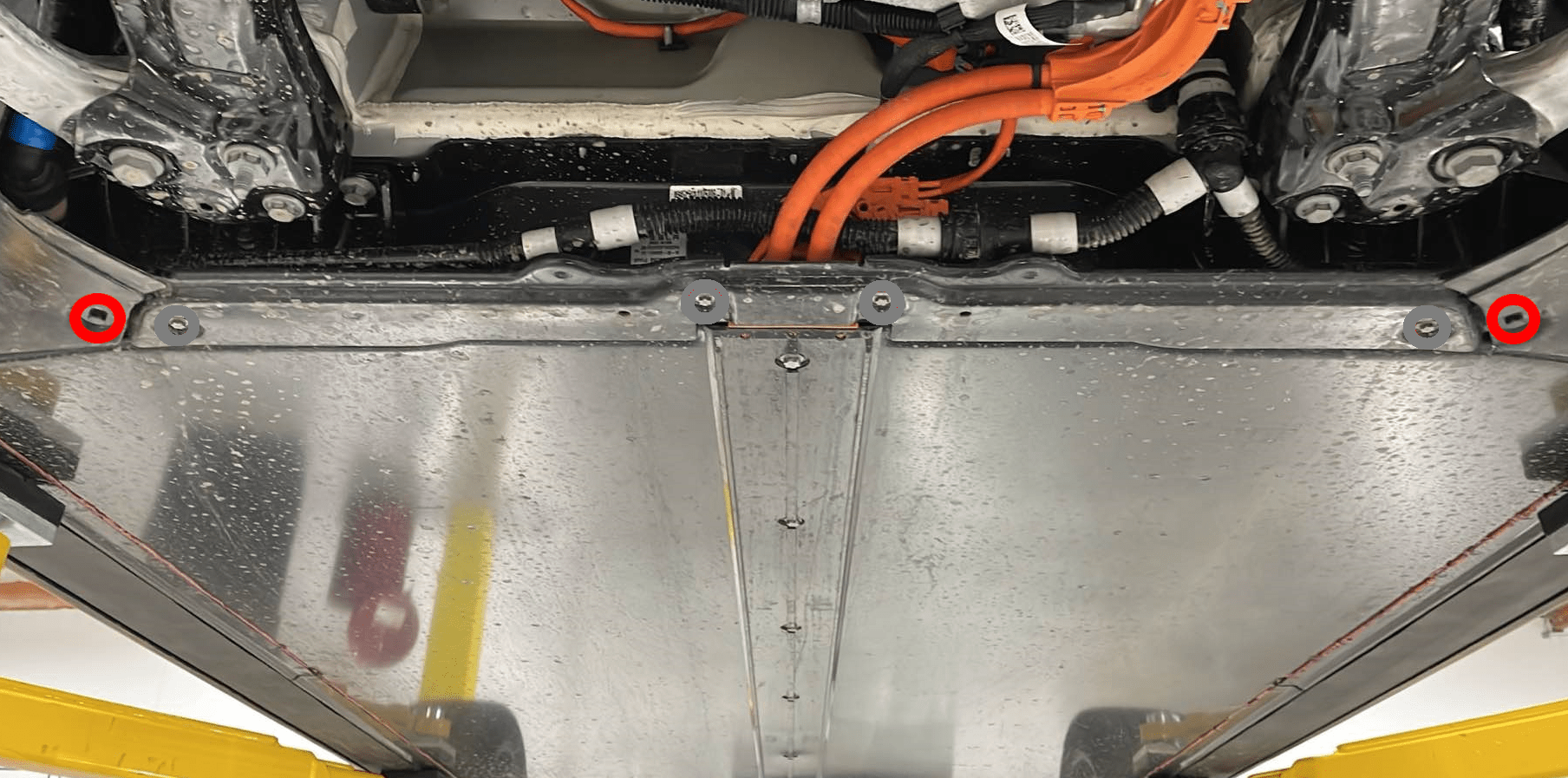 Install the bolts (x2) that attach the skid plate to the HV battery.
