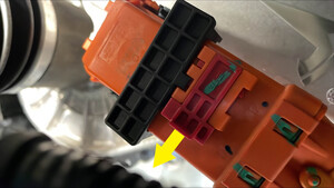 - Connect the front drive unit HV harness from the front drive unit inverter HV header squarely, lower the black handle, and then slide the red locking tab.
