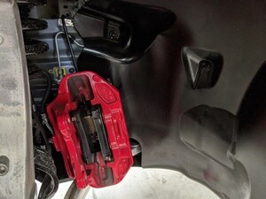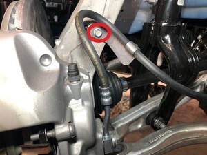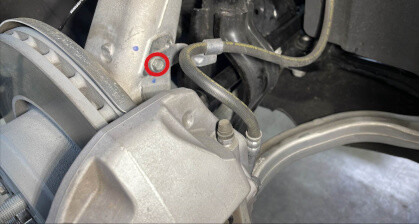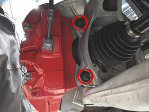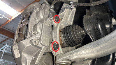 - Remove and discard the bolts (x2) that attach the LH front brake caliper to LH front knuckle, remove the caliper, and then use an S-hook to hang the caliper off to the side.