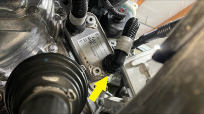- Remove the plugs, immediately connect the front drive unit inverter inlet hose to the powetrain return hose, fasten the clip, and then perform a Push-Pull-Push check of the fitting.