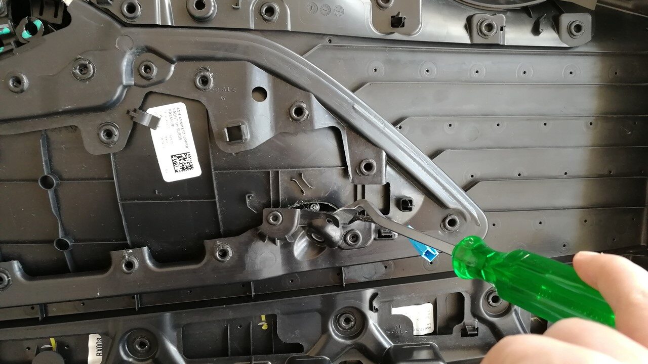 - Attach the front portion of the interior door handle to the interior release switch.