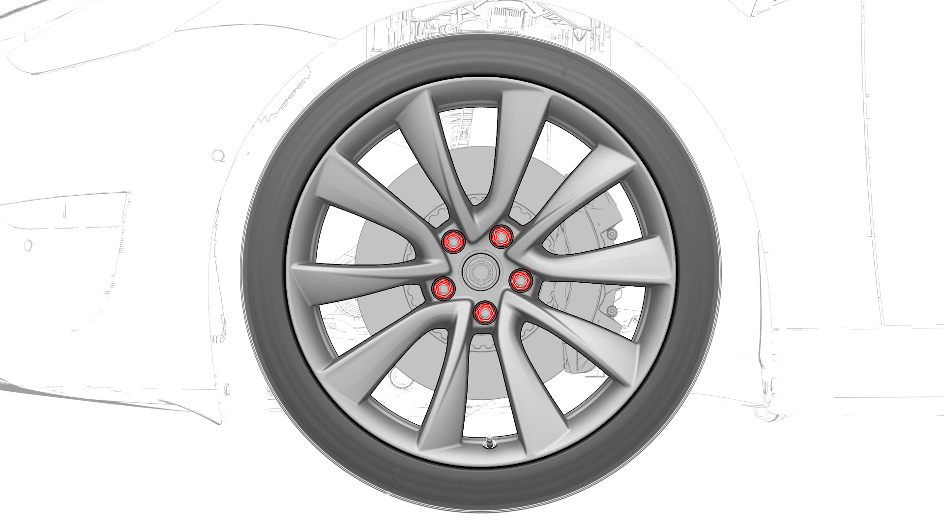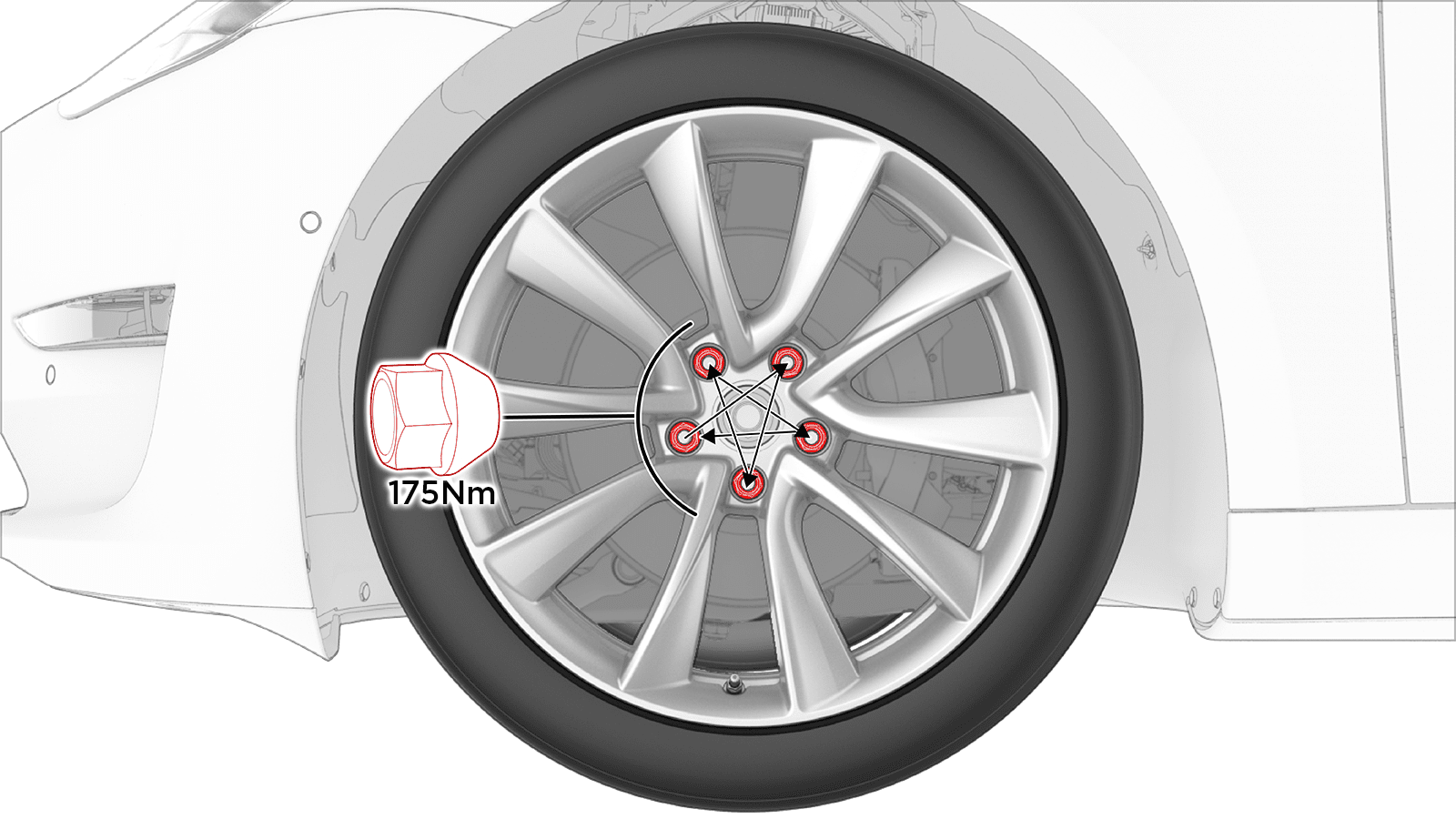 - Use a power tool to tighten the lug nuts (x5) of the wheel to the initial torque in a criss-cross star pattern.