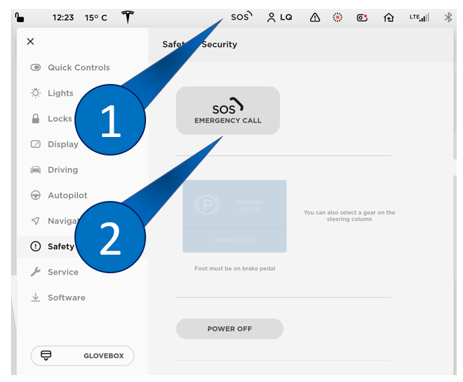 button (1) and the SOS EMERGENCY CALL button (2) are available on the
