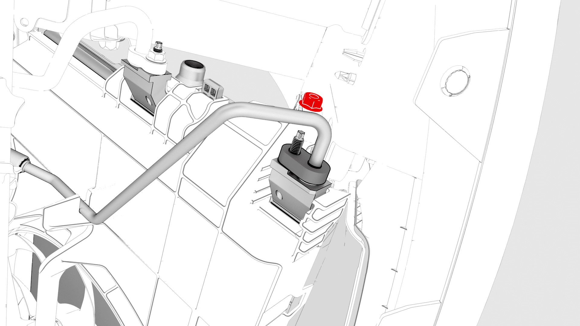 - Remove the nut that attaches the suction/liquid line to the cooling fan module, and then disconnect the A/C suction line.