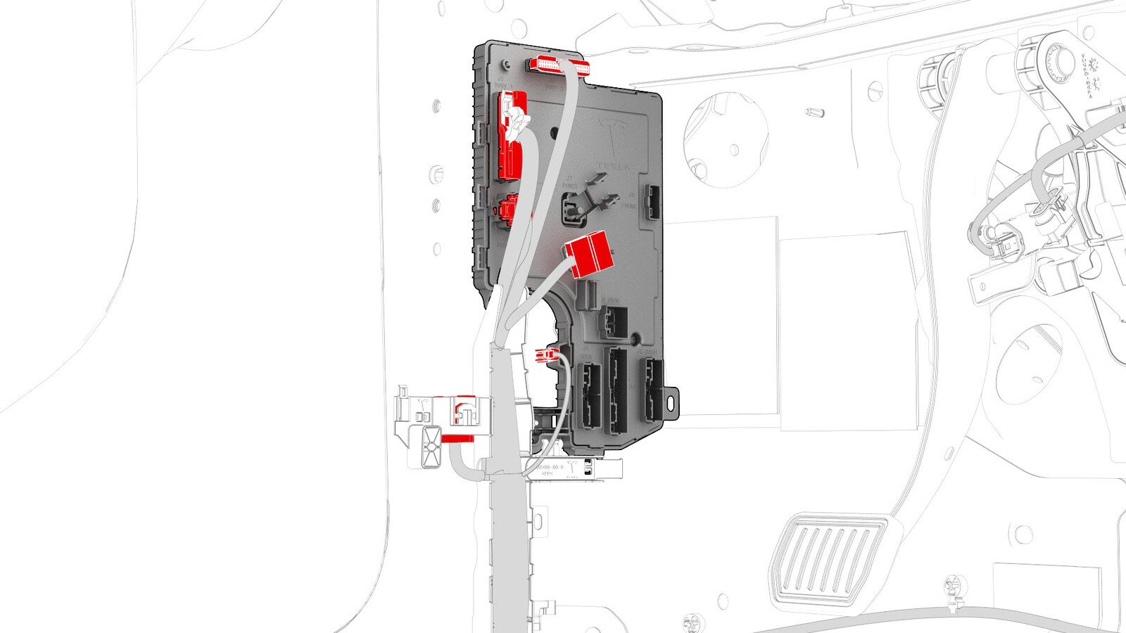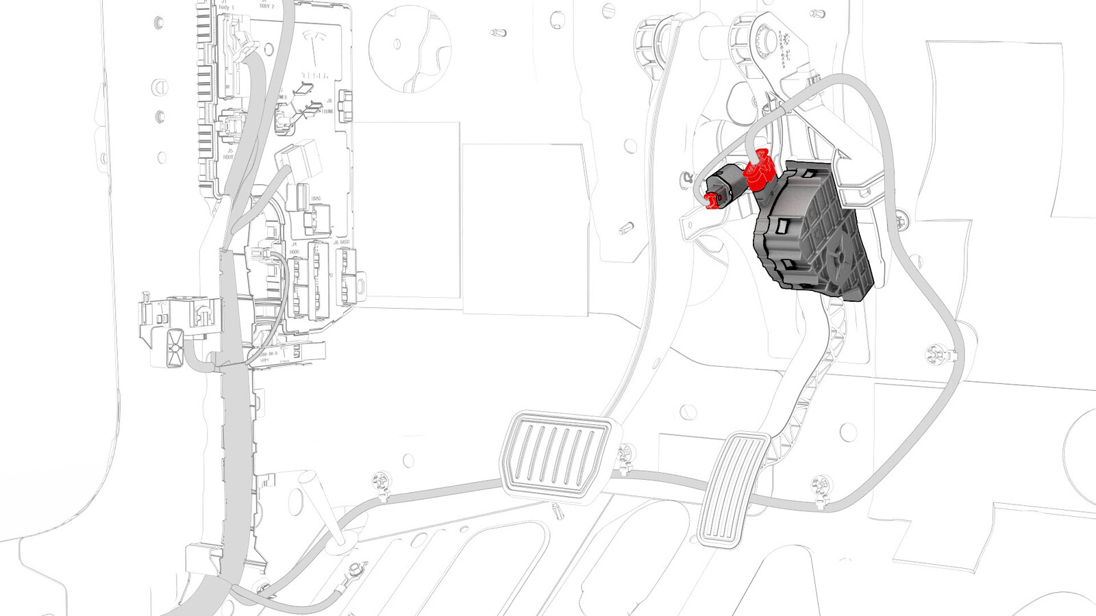 - Connect the electrical harness to the accelerator and the brake pedal connectors.