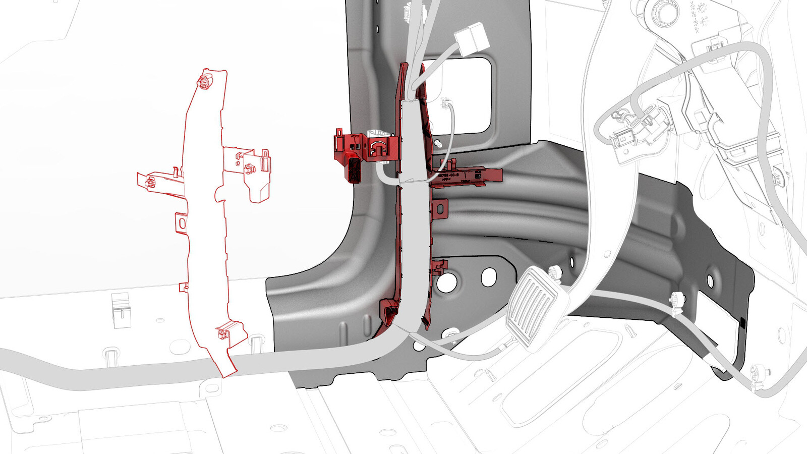 - Release the clips that attach the electrical harness to the body in the LH lower B-pillar areas.