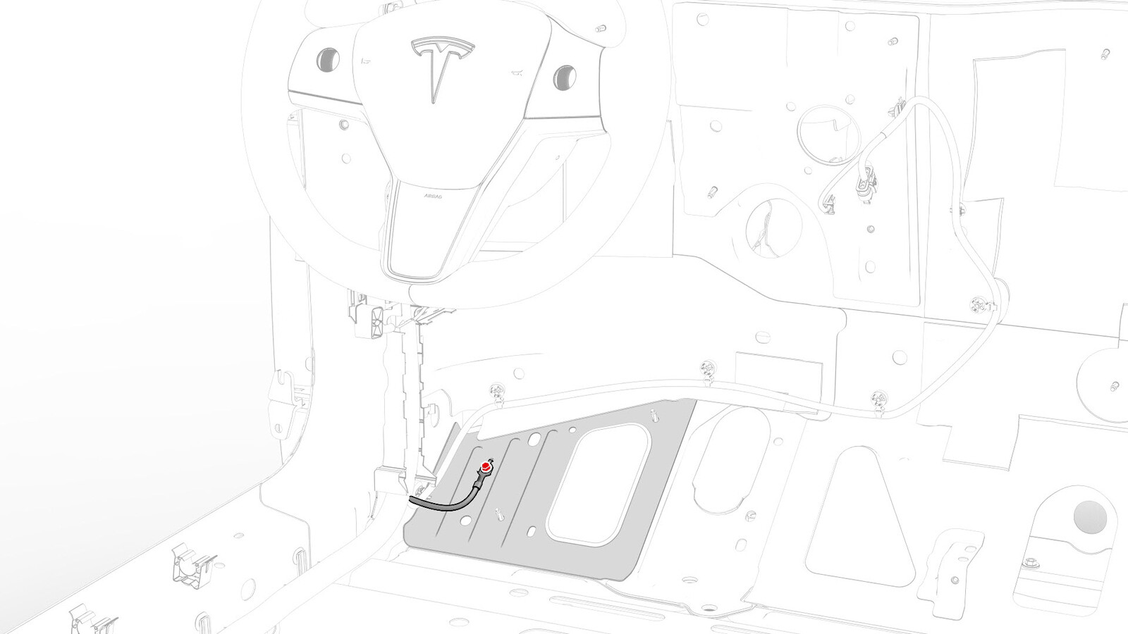 - Remove and discard the bolt that attaches the electrical harness ground strap at the driver footwell area.