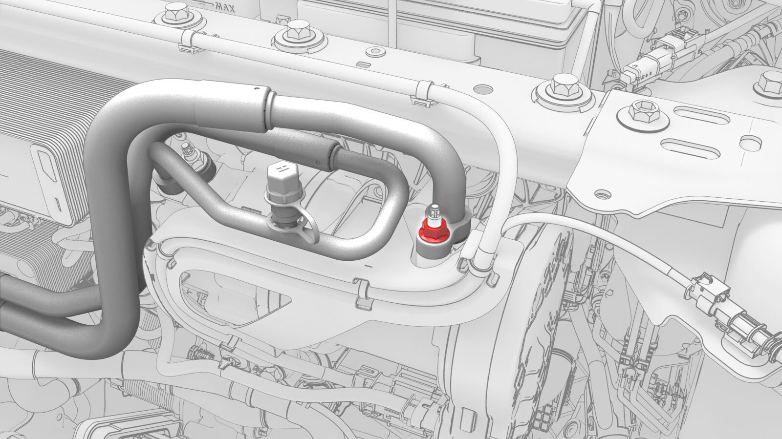 - Position the supermanifold to compressor A/C line onto the supermanifold, and then hand tighten the bolt that attaches the A/C line to the supermanifold.