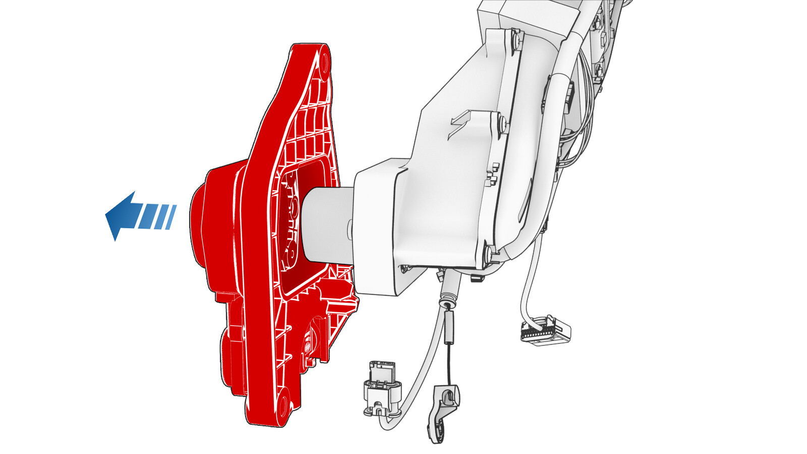- Position the actuator harness on the carrier assembly as pictured, and then tighten the cable tie around the harness at the same location as the old clip.