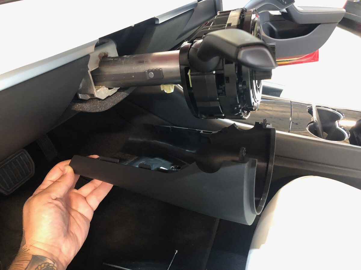 Install connectors to LH footwell cover and position for installation, securing front tabs to driver air bag assembly