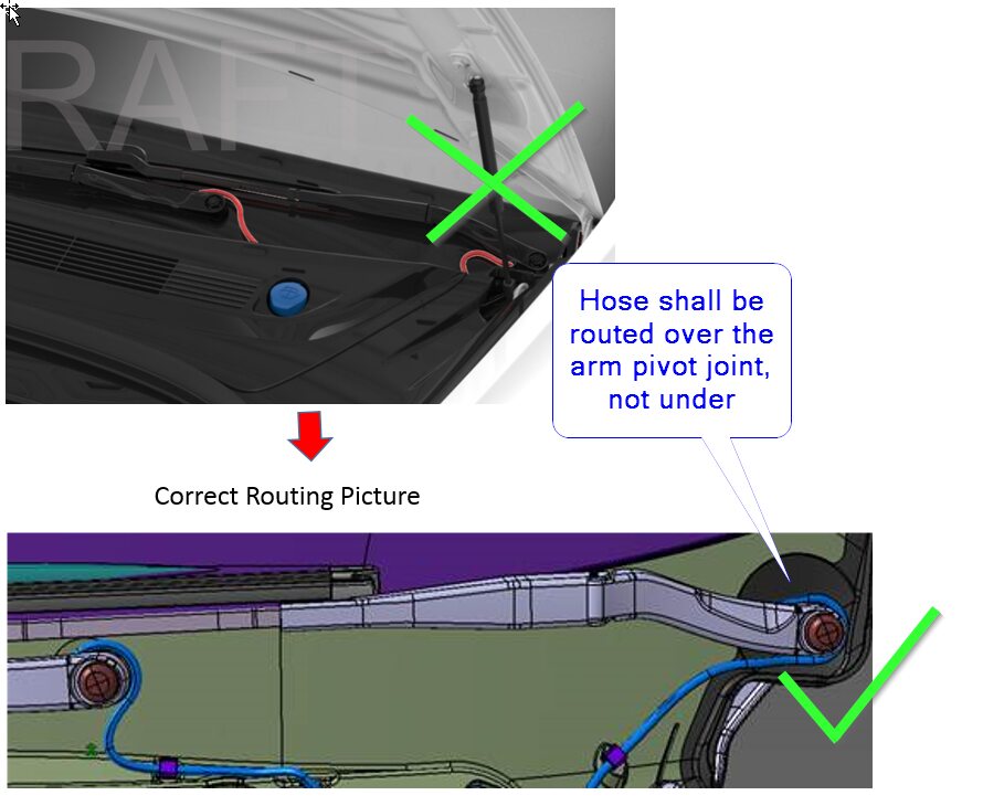 NoteThe washer hose shall be routed over the arm pivot joint, not under