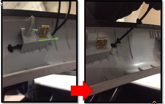 Note1x clip, 2 guide tabs, Align 2 front tabs then align slot with harness bracket and then push rear clip to secure to lower B-pillar