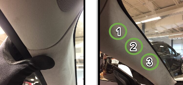 Note1x clip, 1x tab, Align bottom tab then push on top clip to fully seat mid A-pillar, Make sure seal seat on top of trim