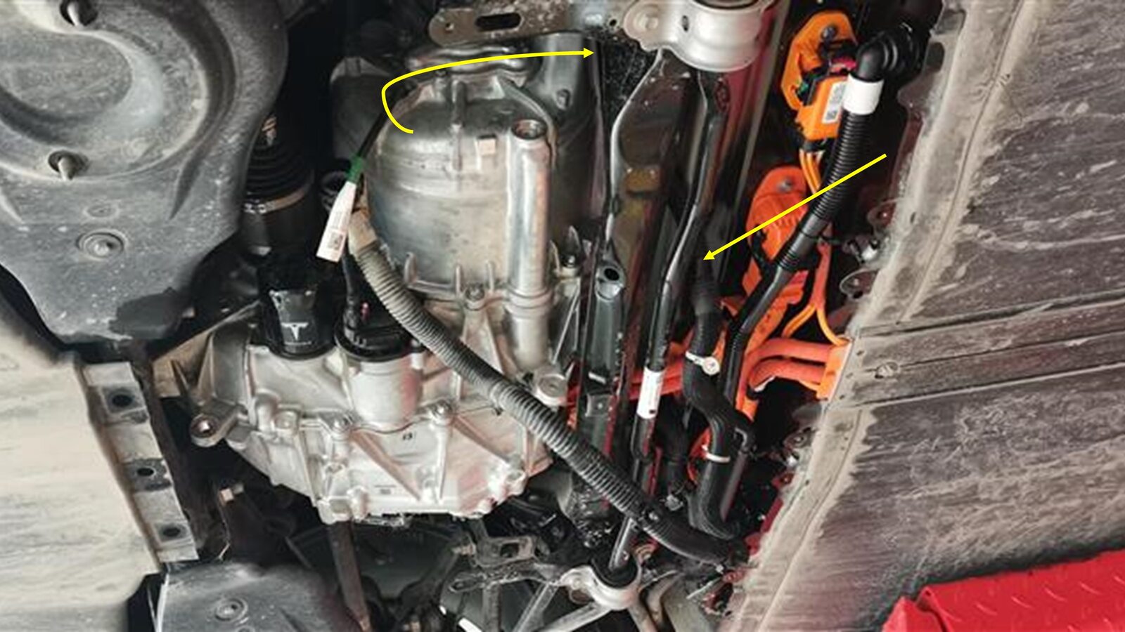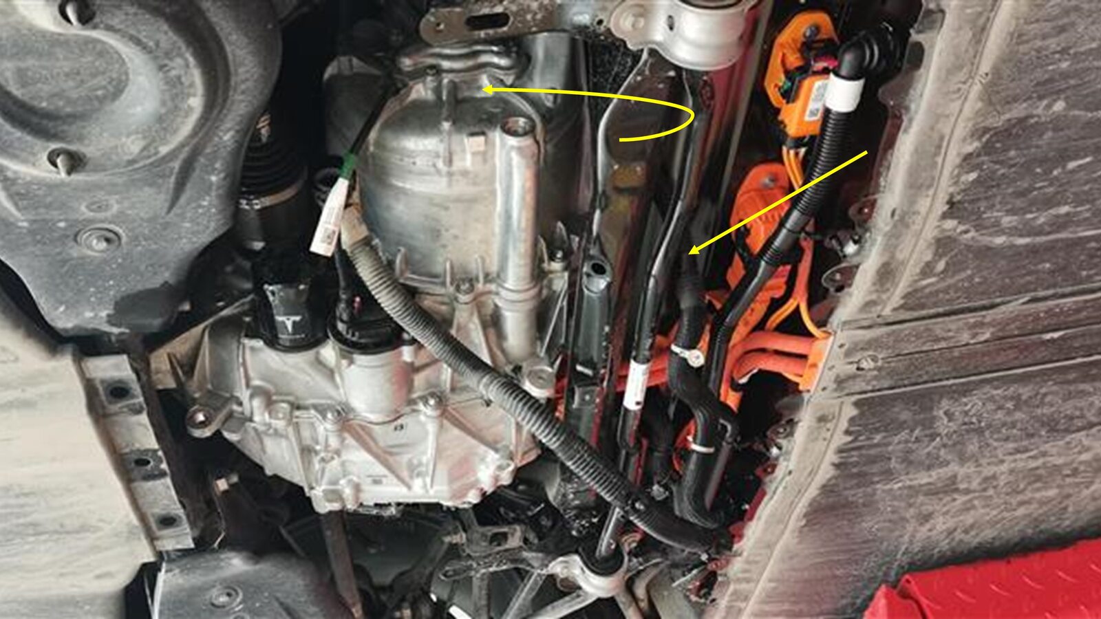 Note1x spring clip, 2x plugs, Lower hose located at RH rear of HV battery, Use shop towel to clean any residue coolant if necessary, Coolant loss greater than 1 L will require vacuum fill