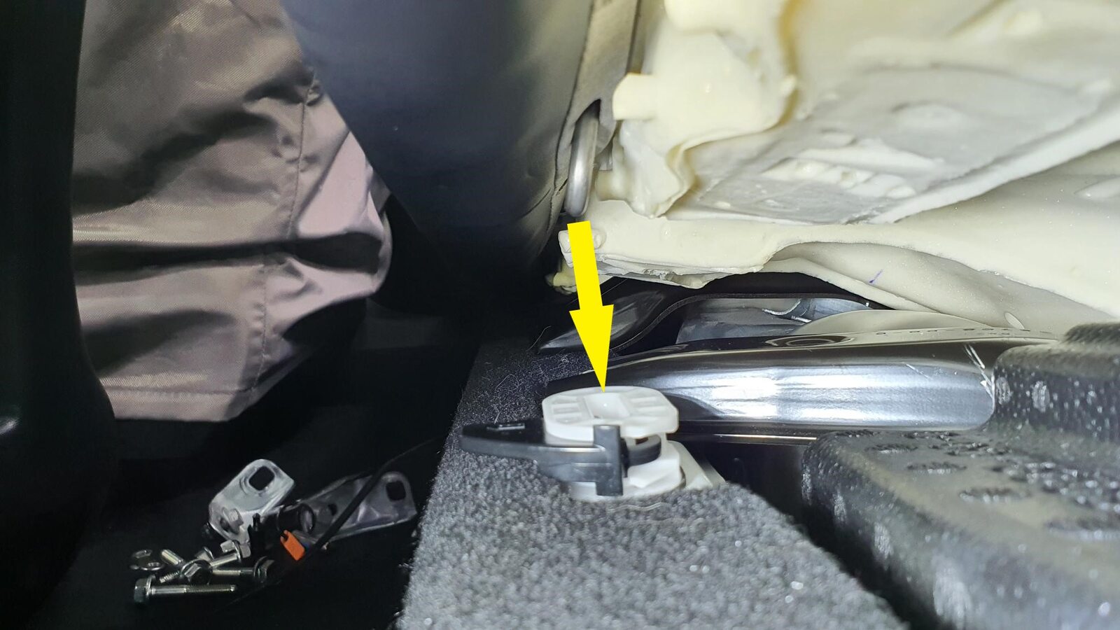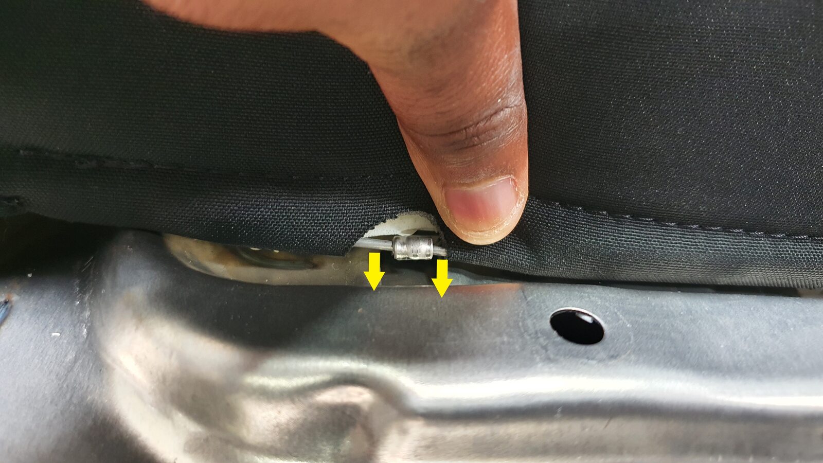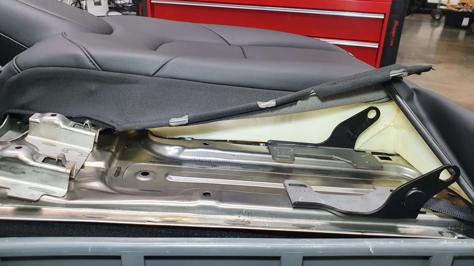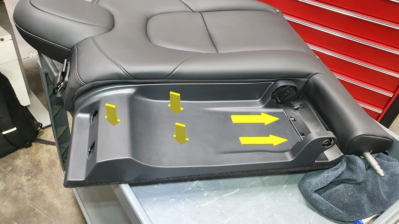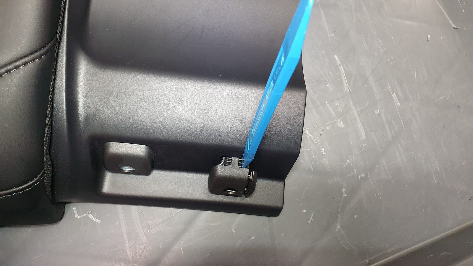 NoteUnhook the long metal piece from the tabs to clear seat cover material