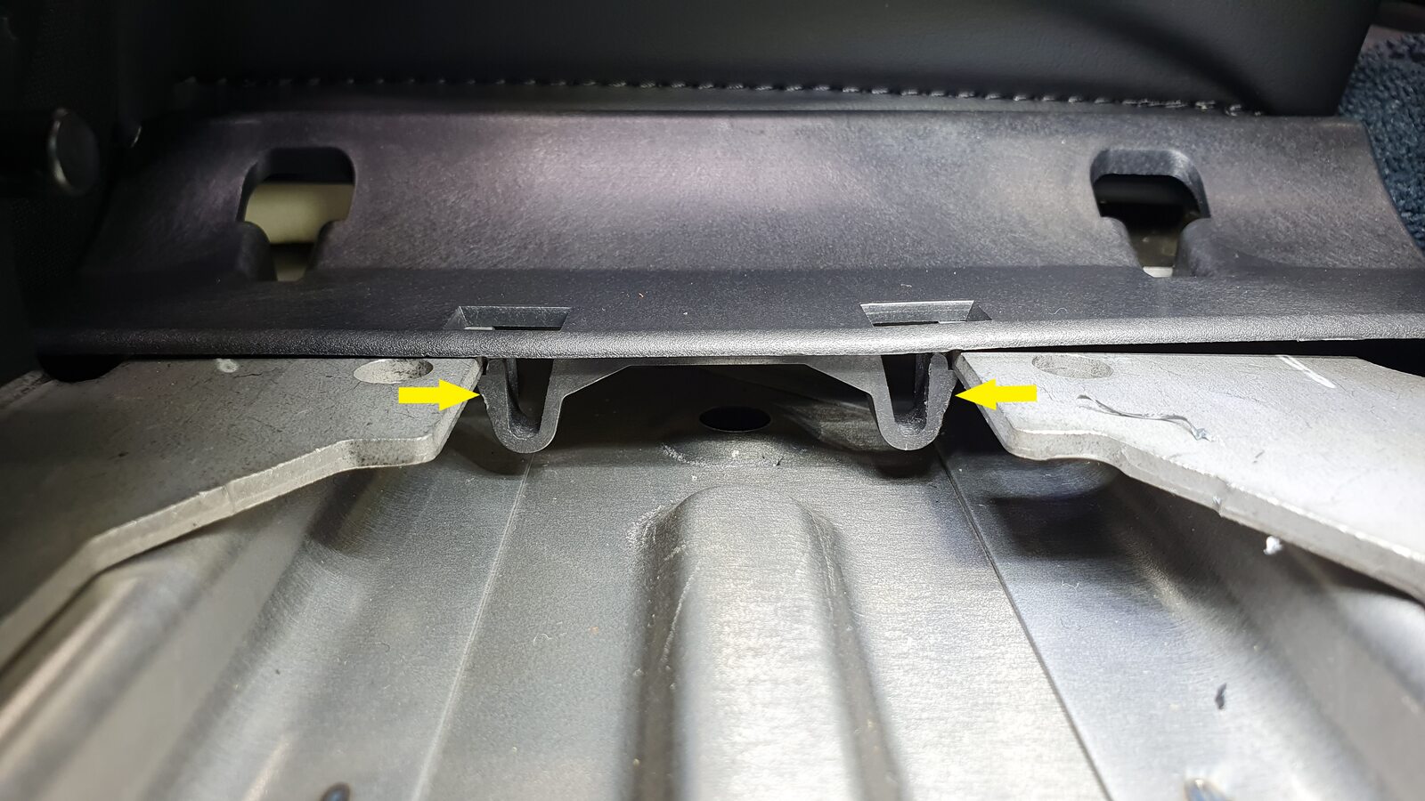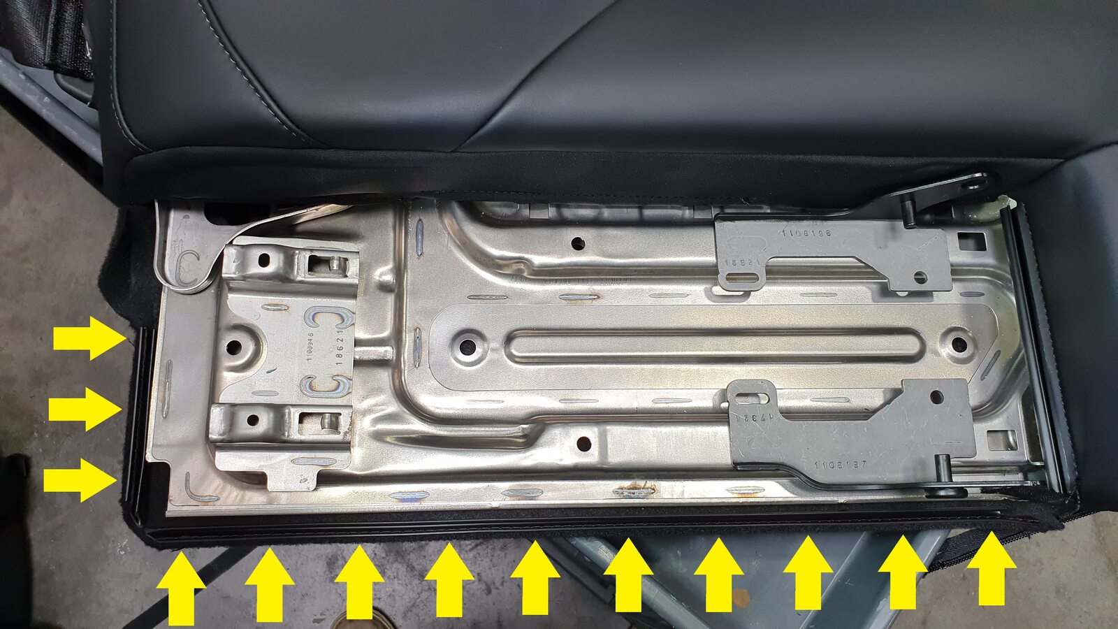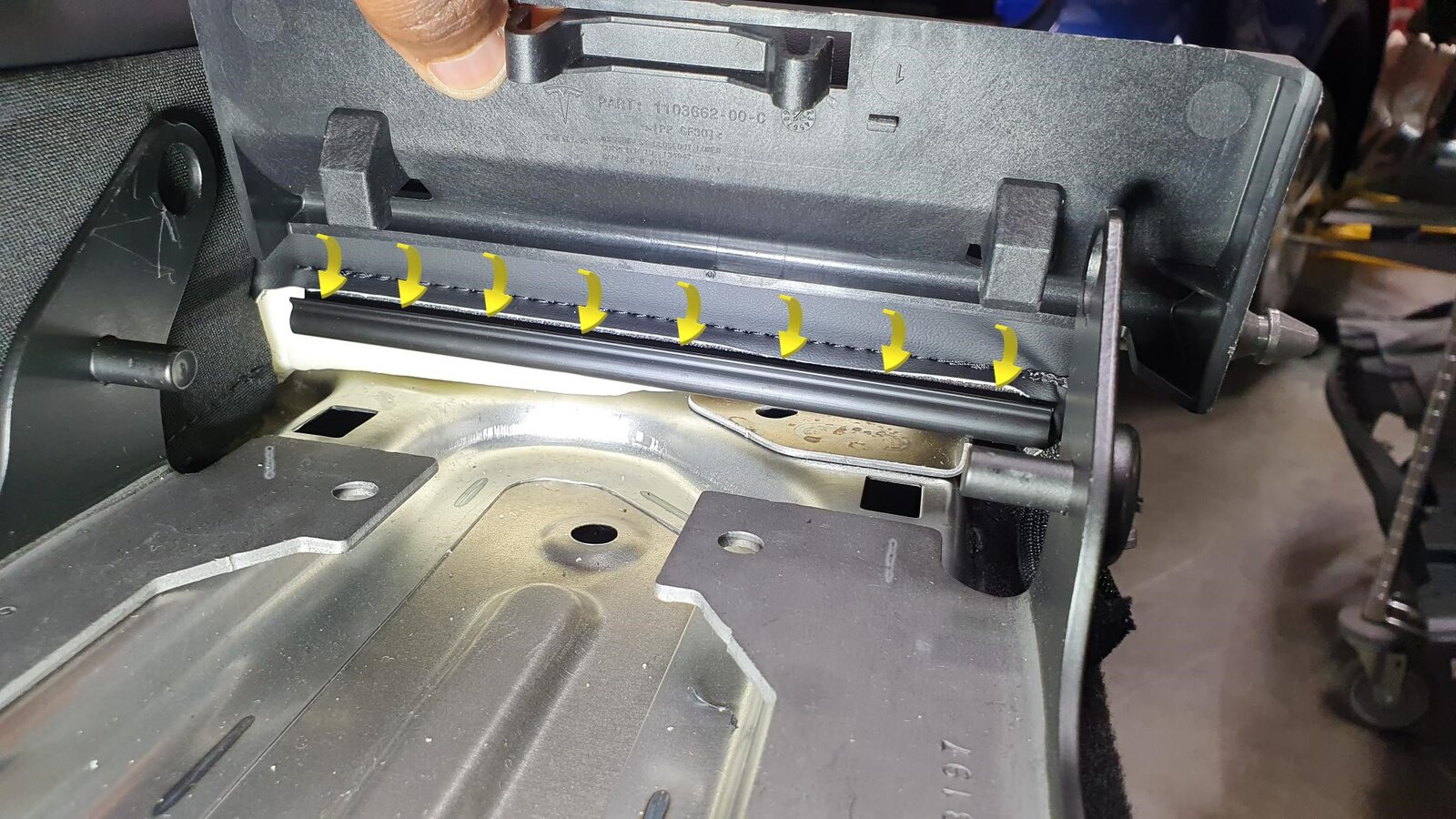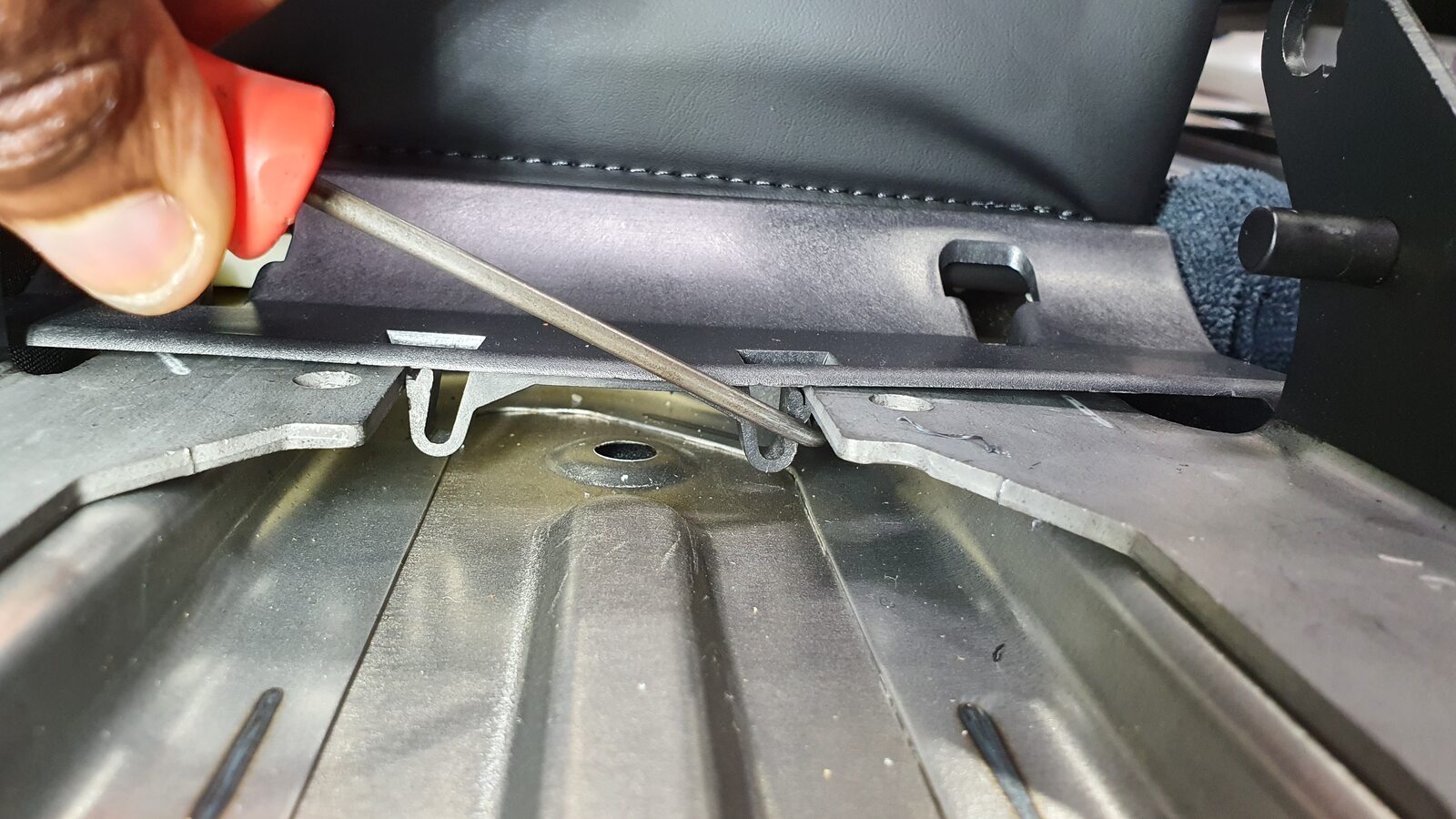 NoteUnhook the long metal piece from the tabs to clear seat cover material