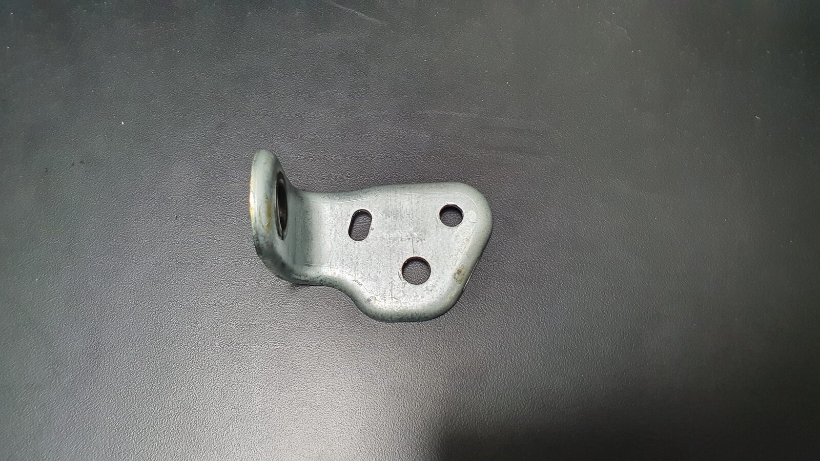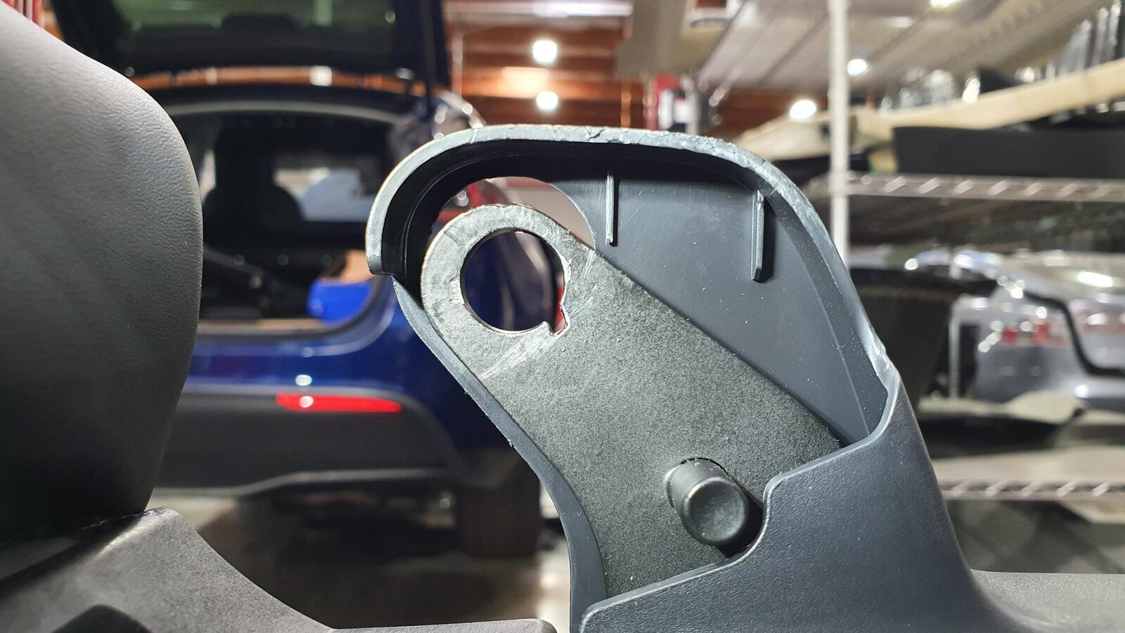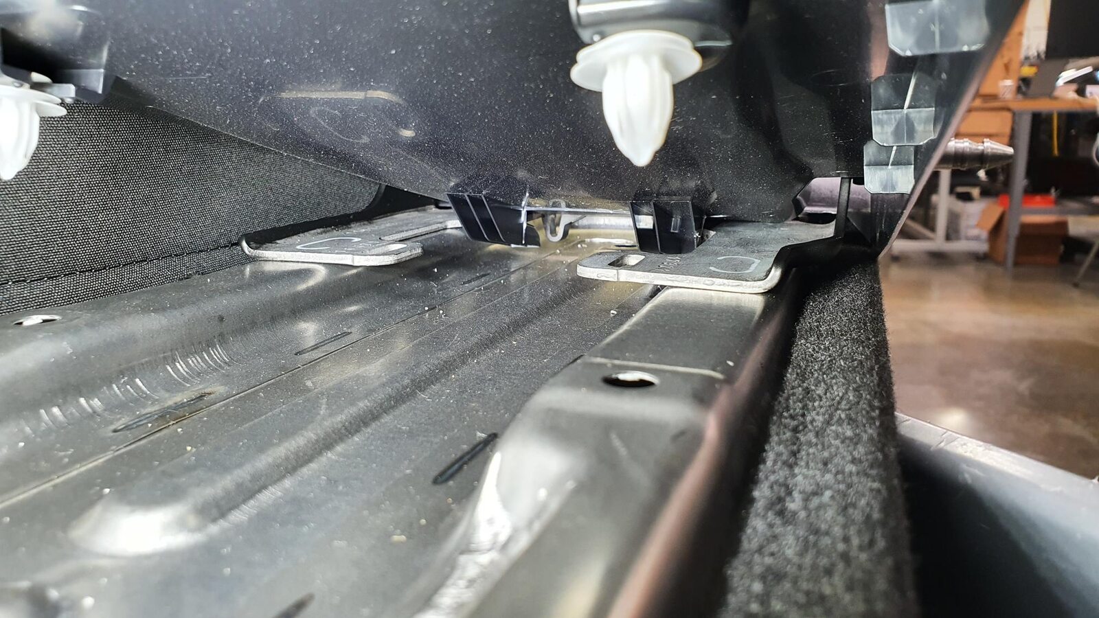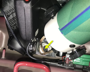 - Set the guide pin of the 2nd row LH seat buckle bracket into the hole of the 2nd row LH inner penthouse rail, and pivot the bracket down onto the anchor, aligning the guide pin to the slot in the anchor.