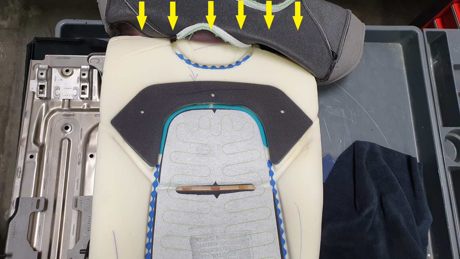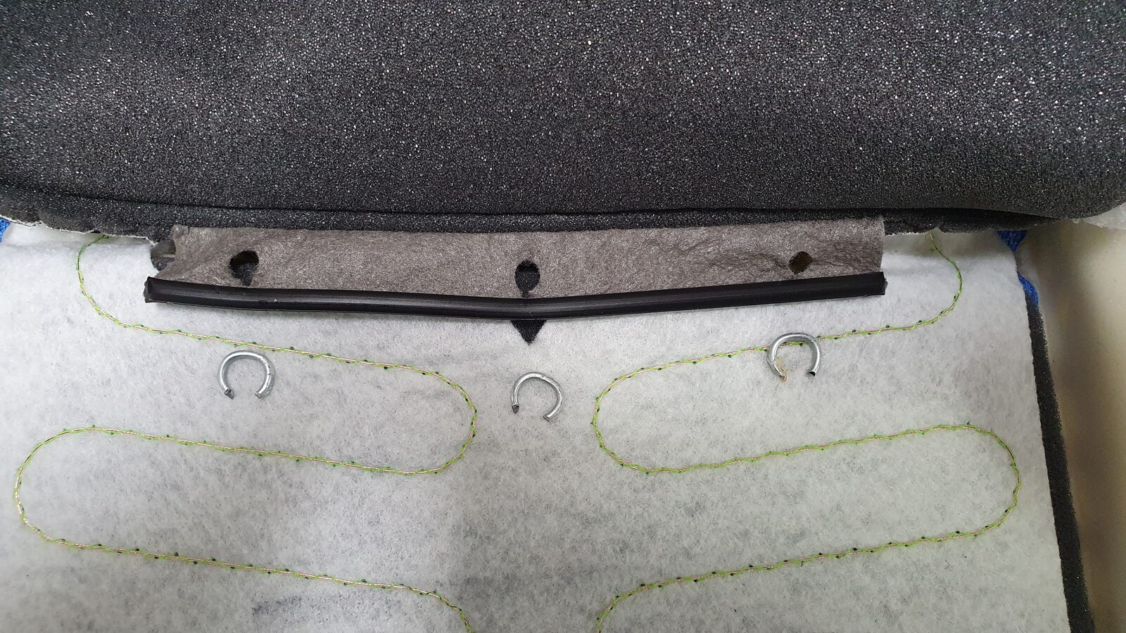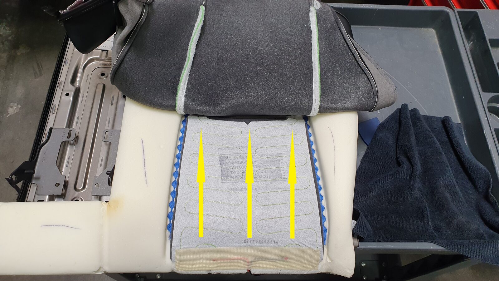 Secure upper Velcro of 2nd row 60 seat back trim cover onto foam pad