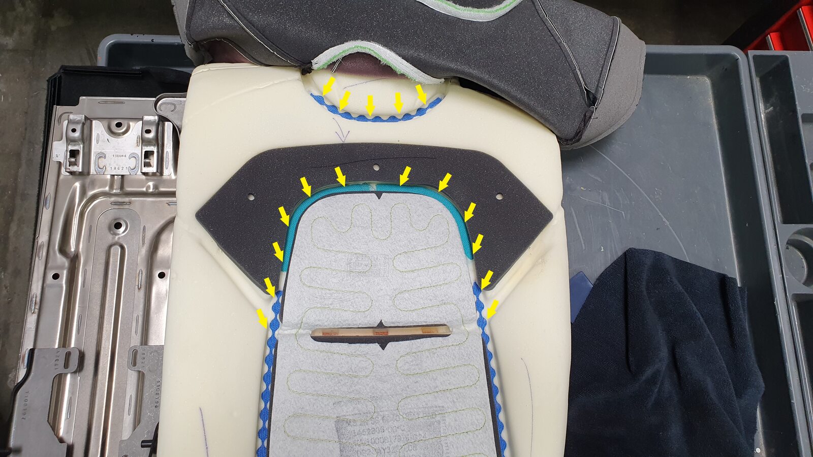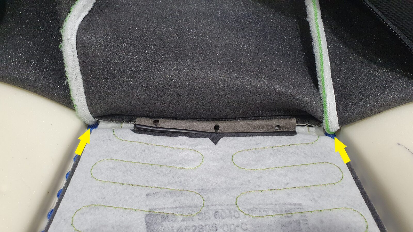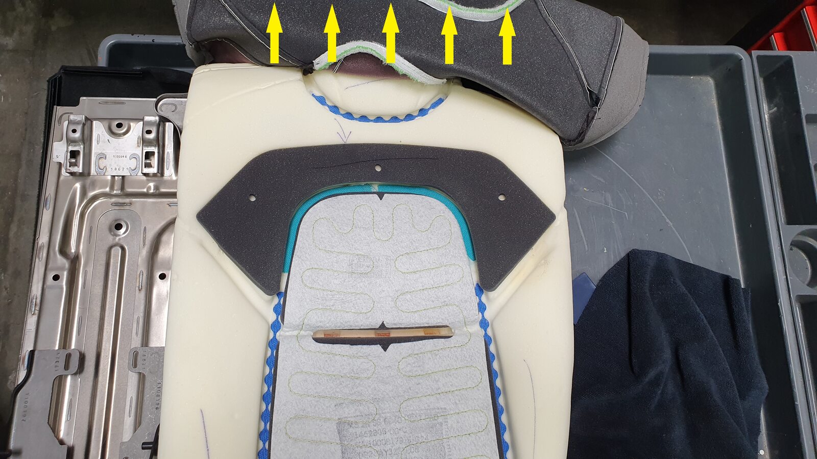 Secure upper Velcro of 2nd row 60 seat back trim cover onto foam pad