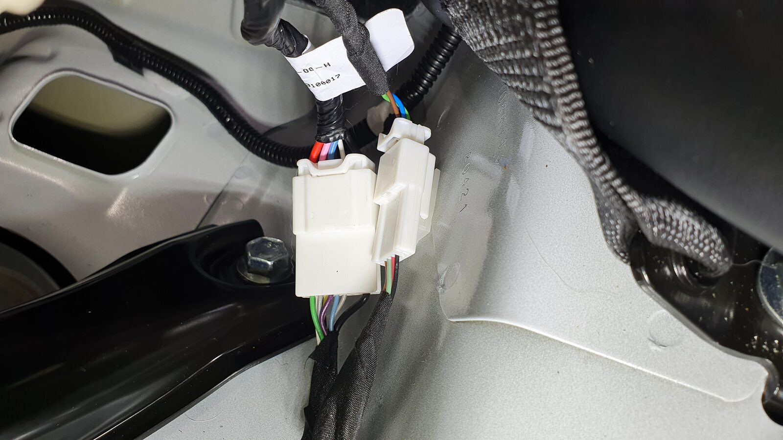 - Install the plastic bracket that attaches the female side of the electrical connector to the body studs.