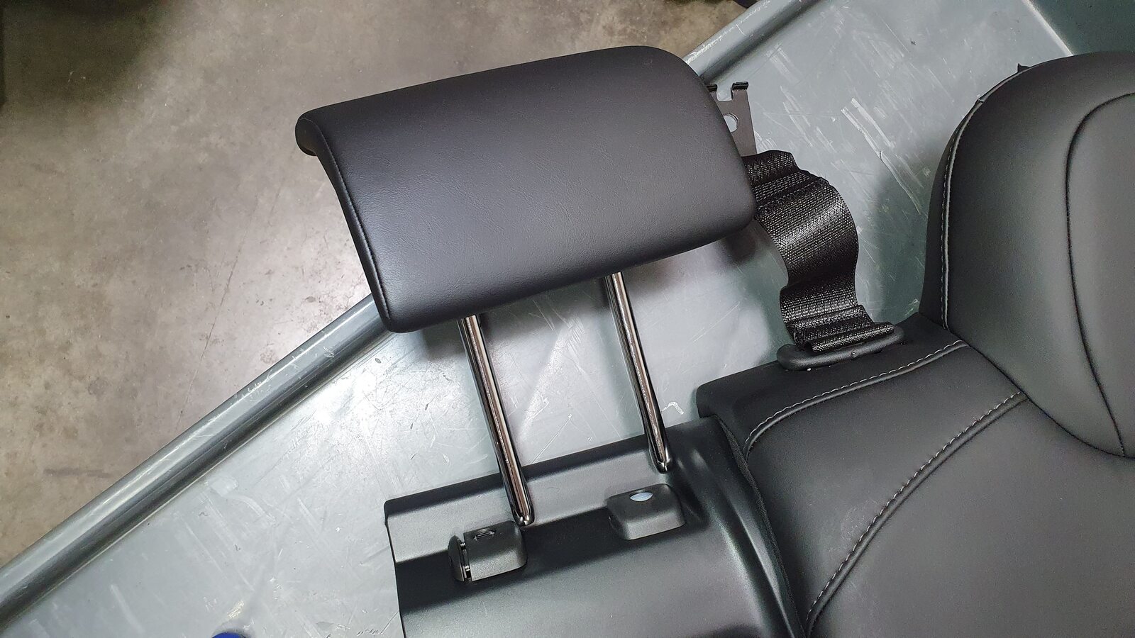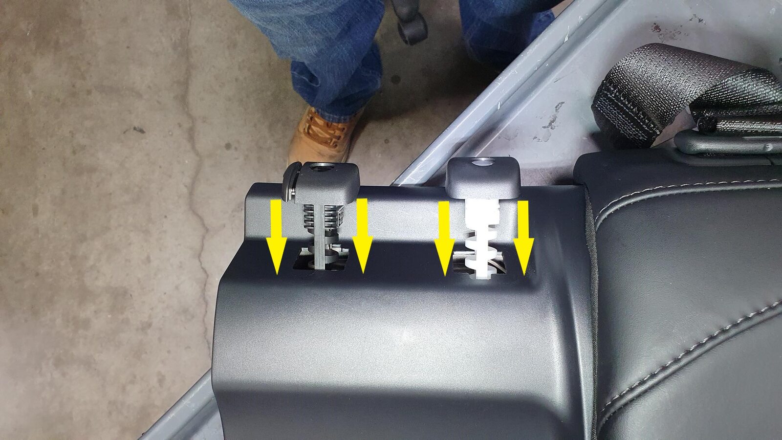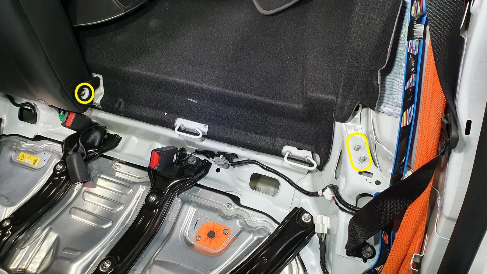 - Set the 2nd row center seat belt anchor onto the 2nd row LH inner penthouse rail, with the belt to the RH side.
