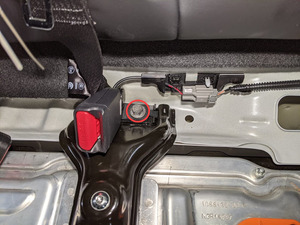 - Connect the electrical harness to the LH rear seat belt buckle connector.