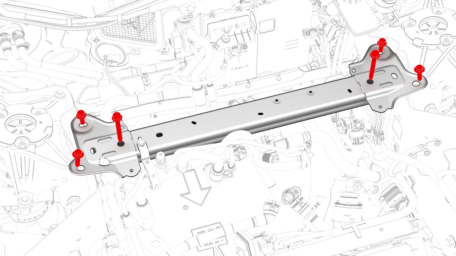 - Remove and discard the bolts (x3) that attach the LH front electrical harness ground straps to the LH shock tower, and then move the electrical harness aside.
