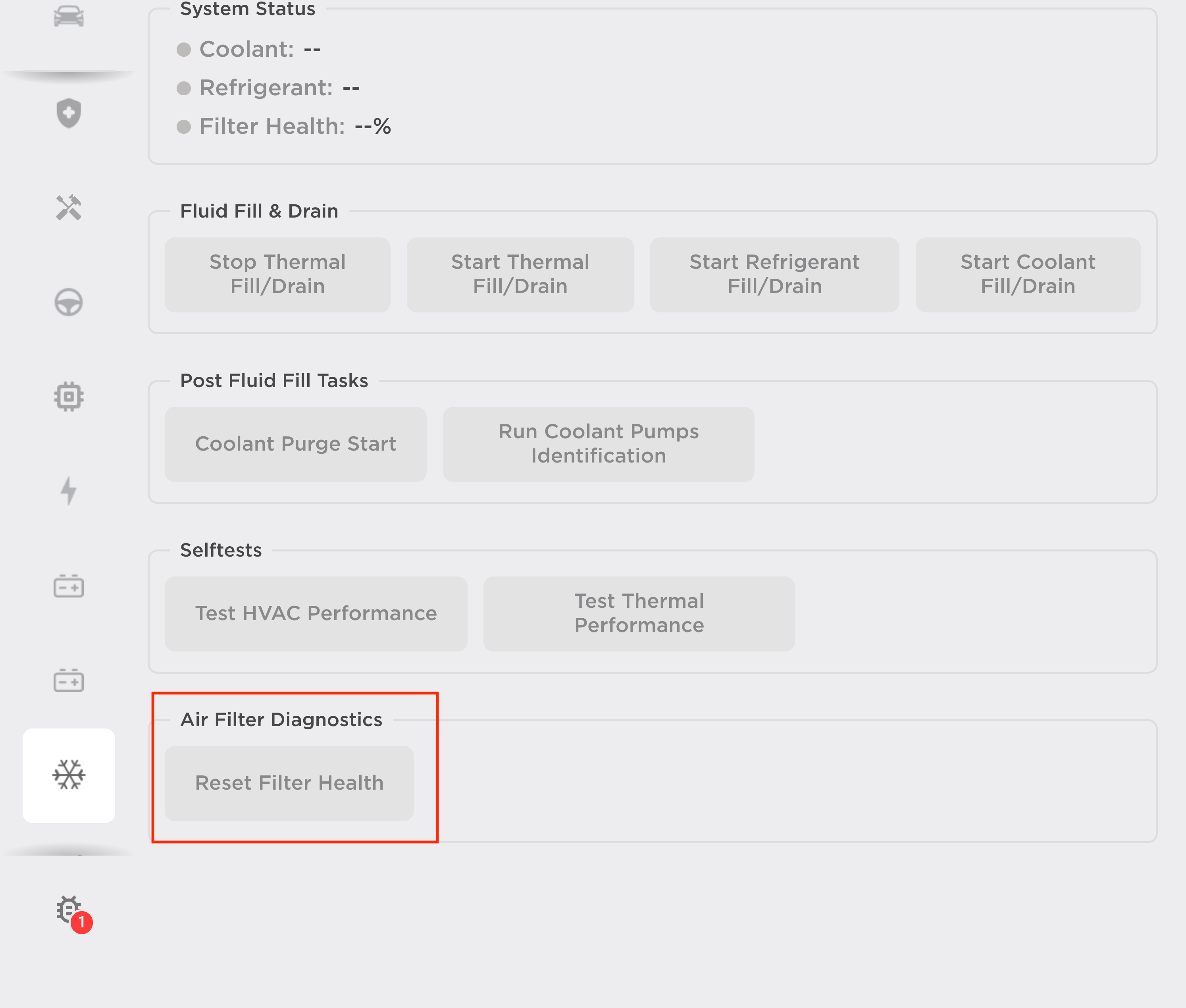 - For Model 3 with PTC heater: In the Service Mode menu, touch Thermal (snowflake icon), and in the "Air Filter Diagnostics" section, touch Reset Filter Health. The cabin filter health score is now reset for PTC heater Model 3. Skip to the next step in this procedure.