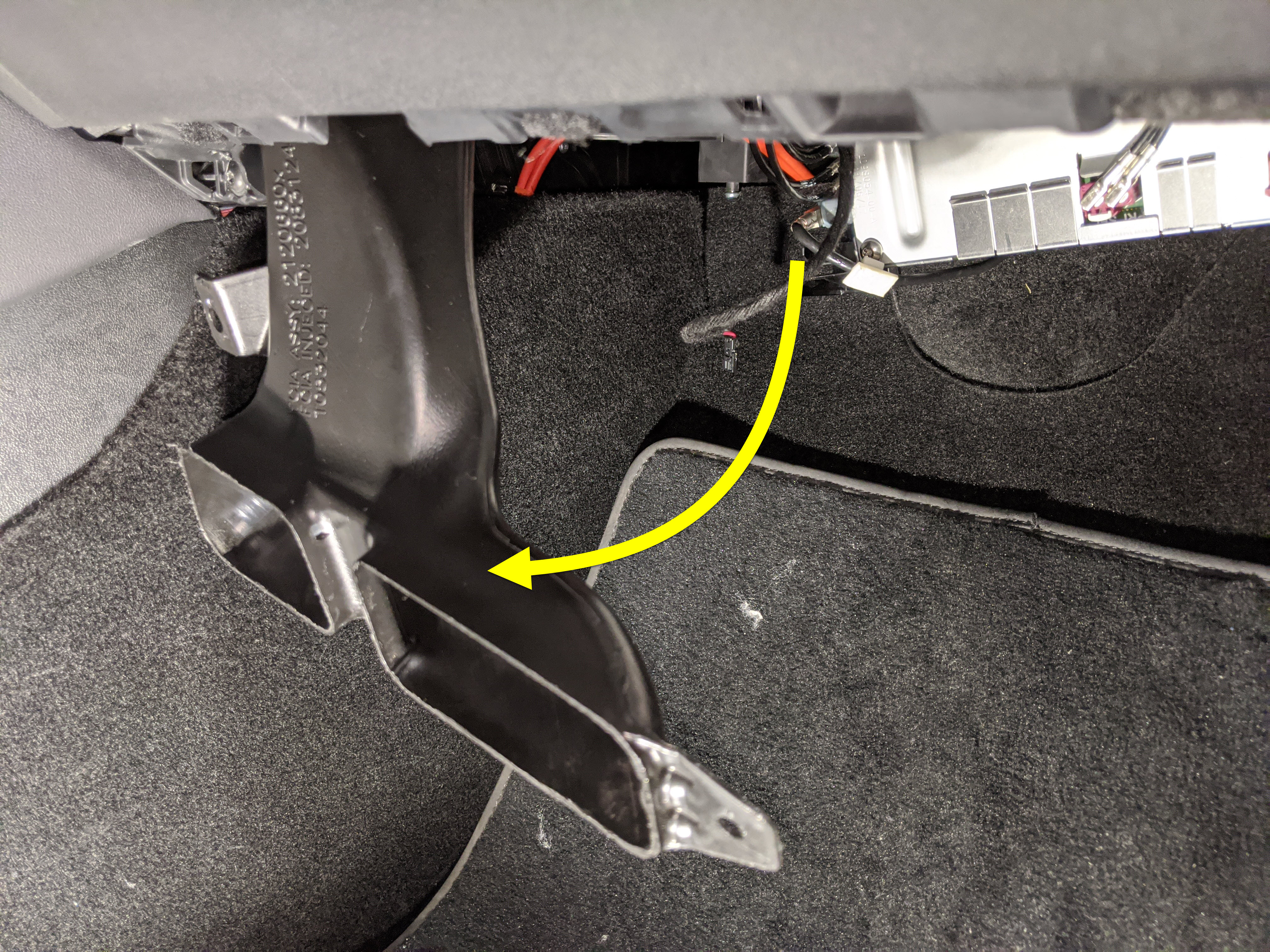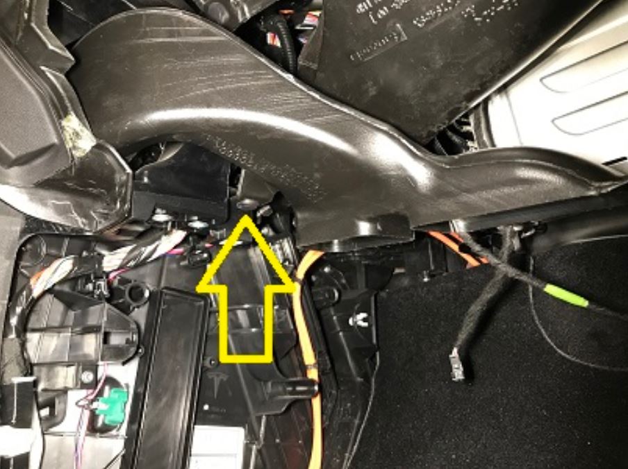 - Remove the clip that attaches the passenger footwell air duct, and then rotate the duct down and away from the IP for access.