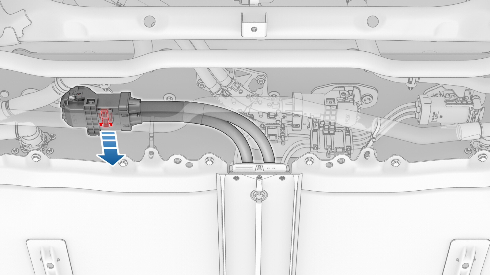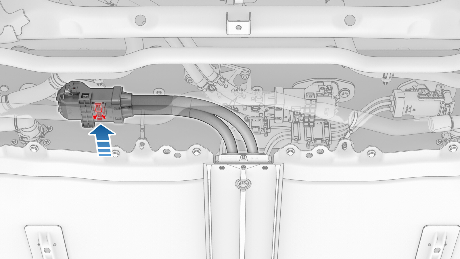 - Slide the release to lock the front drive unit HV connector handle in the secured position.