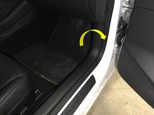 Note1x clip, 2 guide tabs, Pull rear of lower A-pillar upward to release clip then pull rearward to release front tabs from carpet