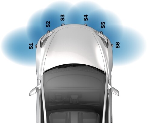 are S3 and S4. Outer parking distance sensors are S1, S2, S5, and S6. See Sensor - Parking Distance - Outer - Front (Remove and Replace)