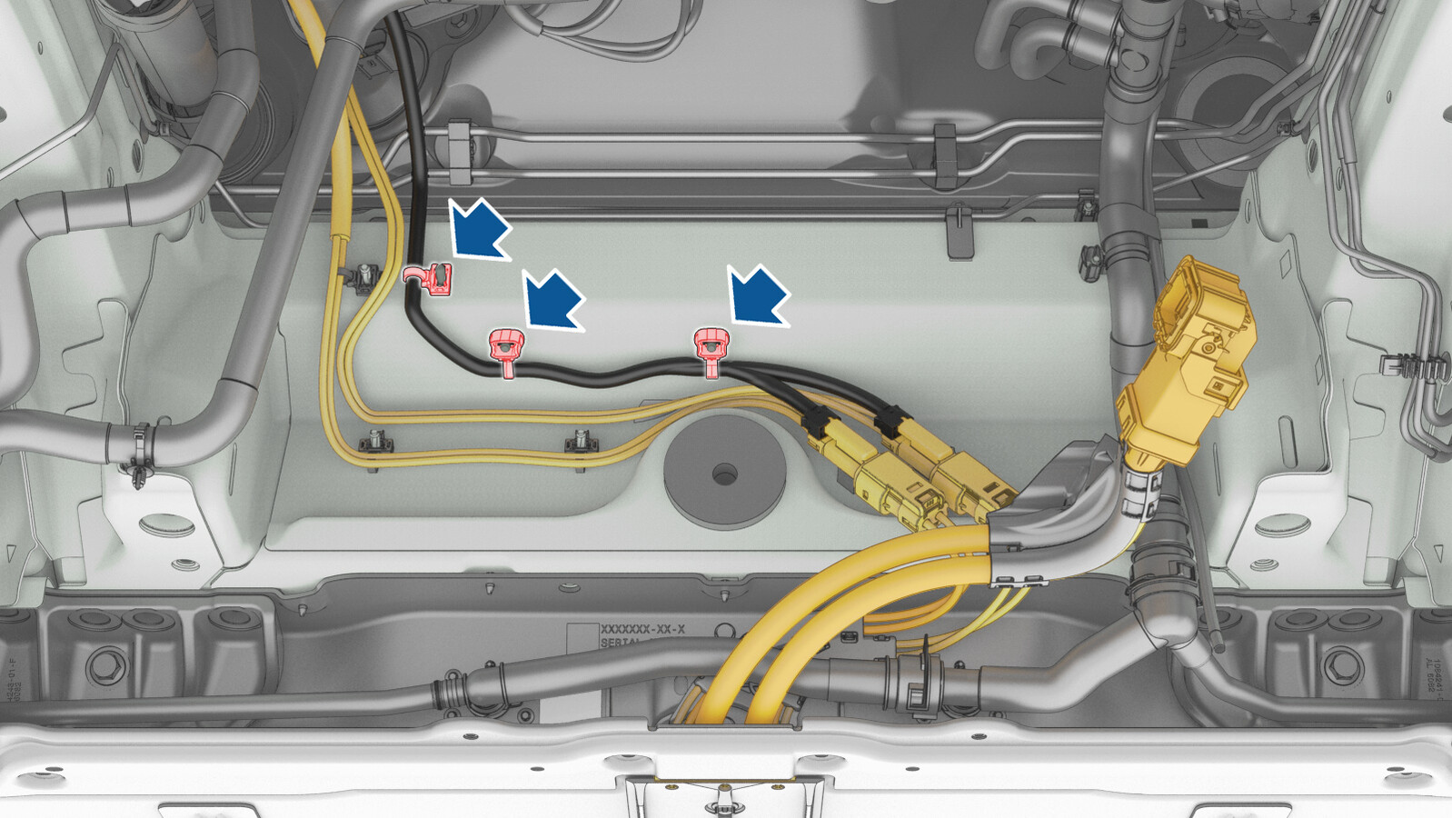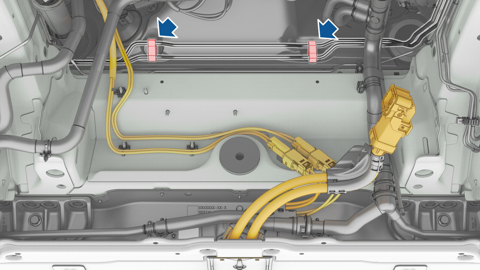 - Release the clips that attach the main front harness to the body in the front LH frame rail area, and then move the LH side of the front harness aside for access.