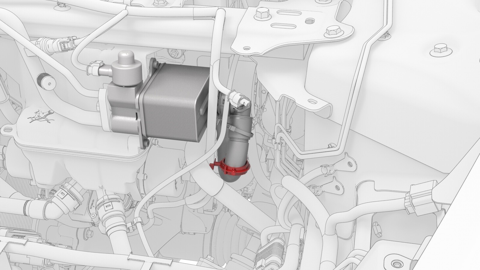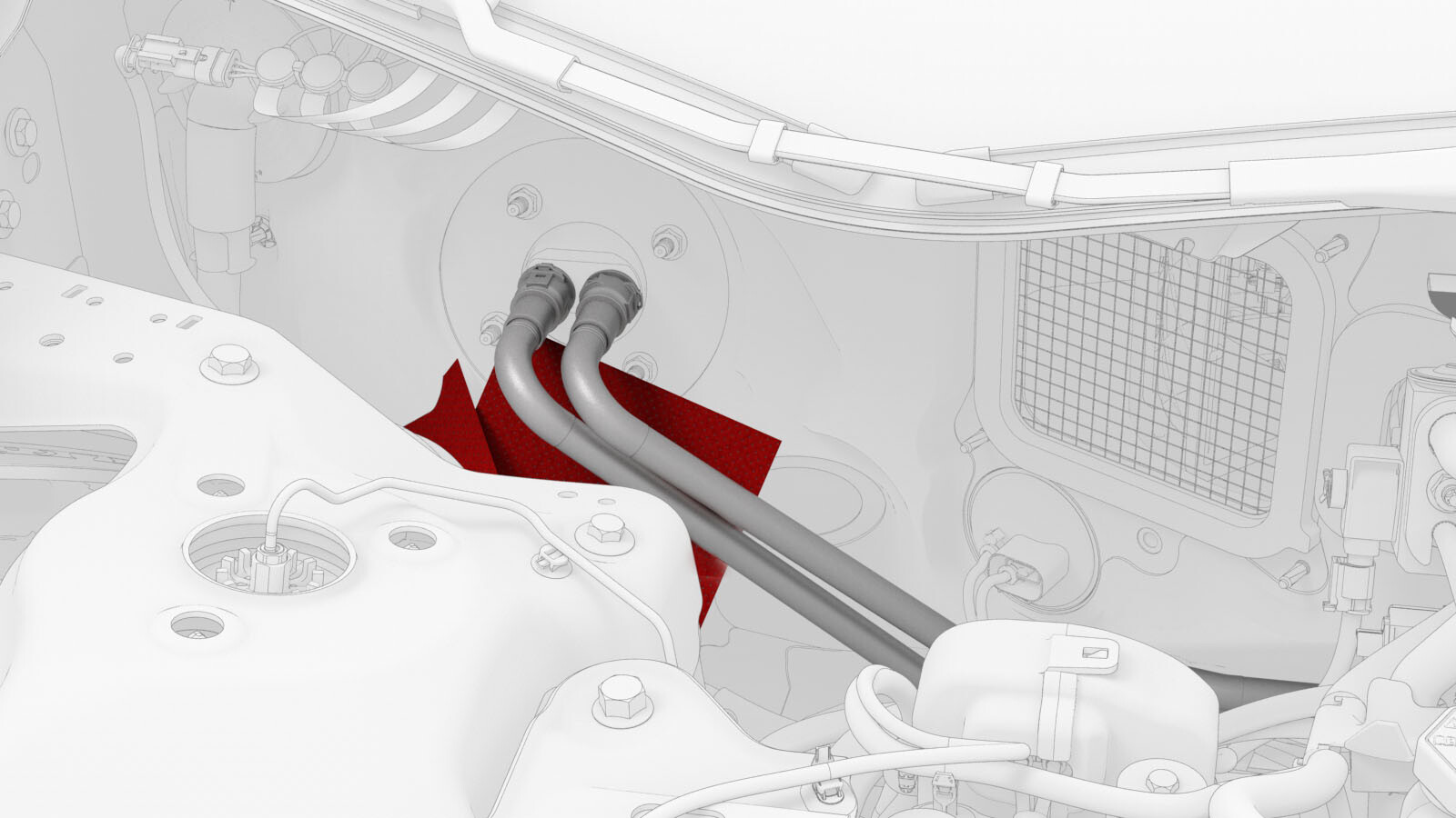 - Release the clip that connects the RH car computer coolant hose to the car computer coolant port, and then disconnect the hose.