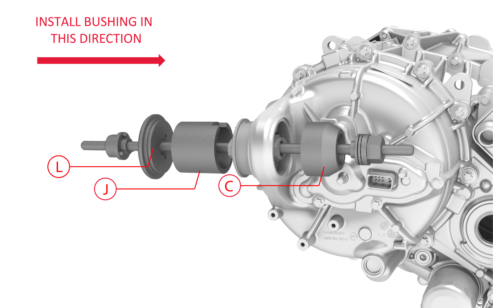 CAUTIONApply torque only to the bearing-side bushing tool nut.NoteWhile installing the bushing, make sure the rubber tab remains visible at the top of cup "J".