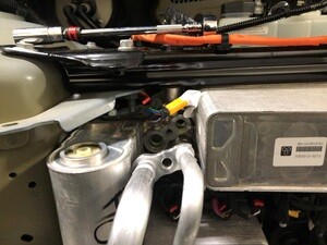 - Install the retaining clips that secure the AC compressor HV harness to the shock tower brace.