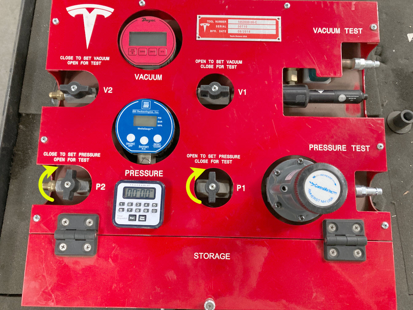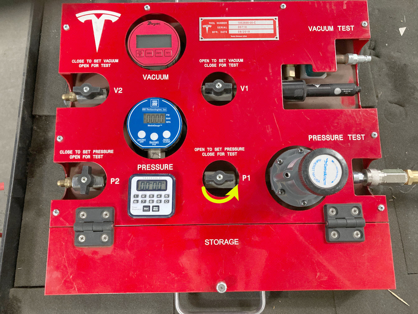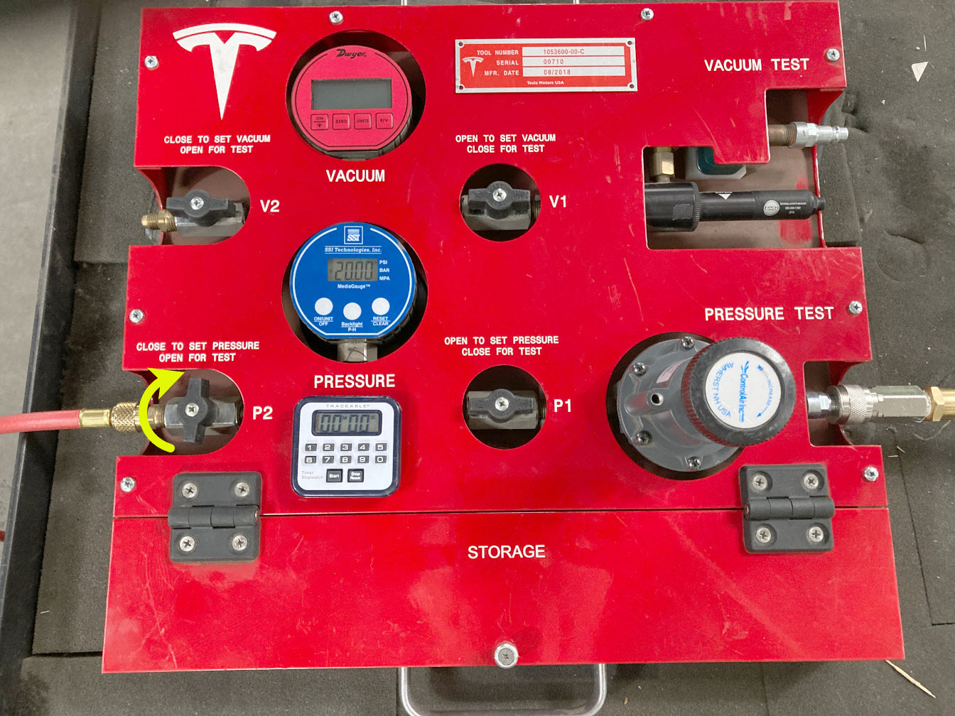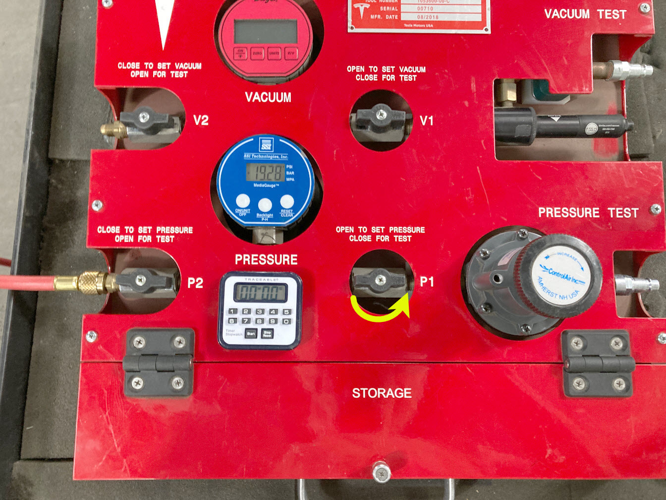 - On the drive unit pressure test fixture, turn both valve P2 (outlet) and valve P1 (inlet) clockwise to close.
