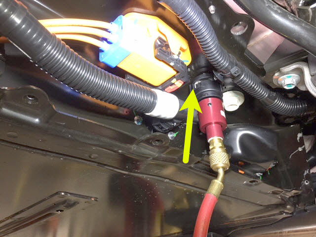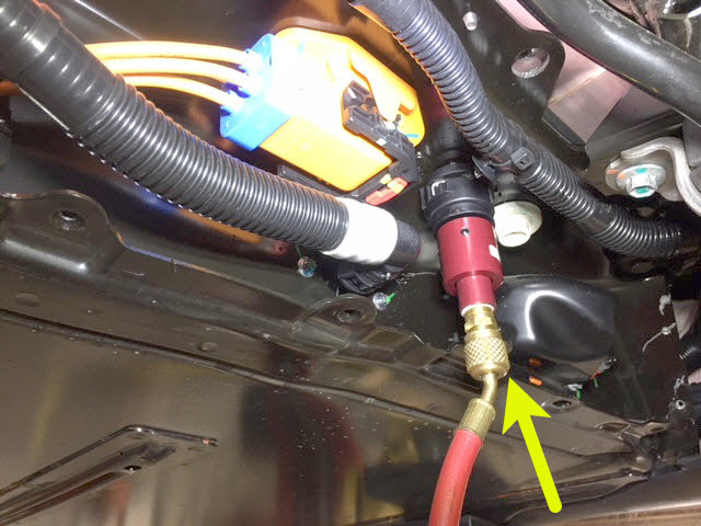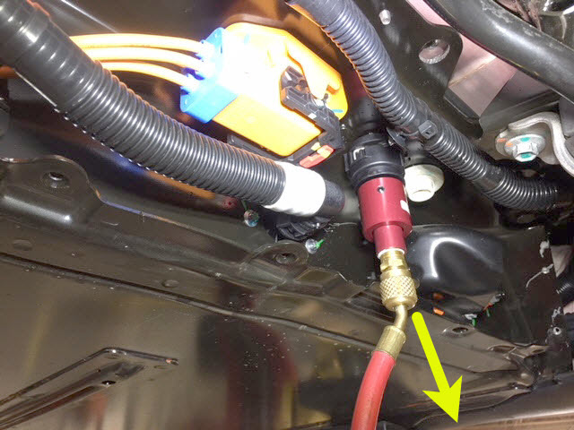 - Connect the coolant pressure test adapter to the male fitting on the RH underside of the ancillary bay.