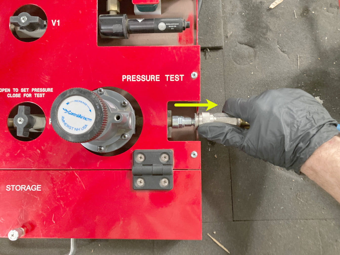 - Connect the supply air hose to the right side of the drive unit pressure test fixture.