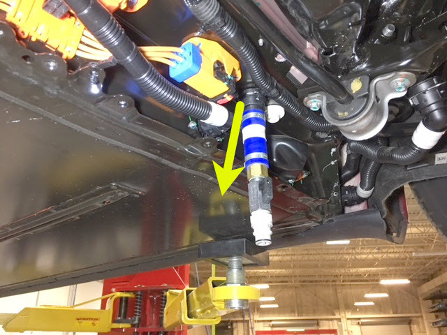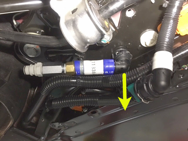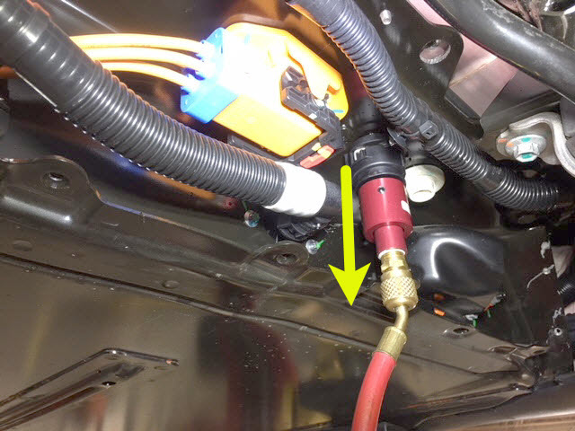 - Fasten the clip, and then connect the coolant pressure adapter and outlet air hose together to the male fitting on the RH underside of the ancillary bay.